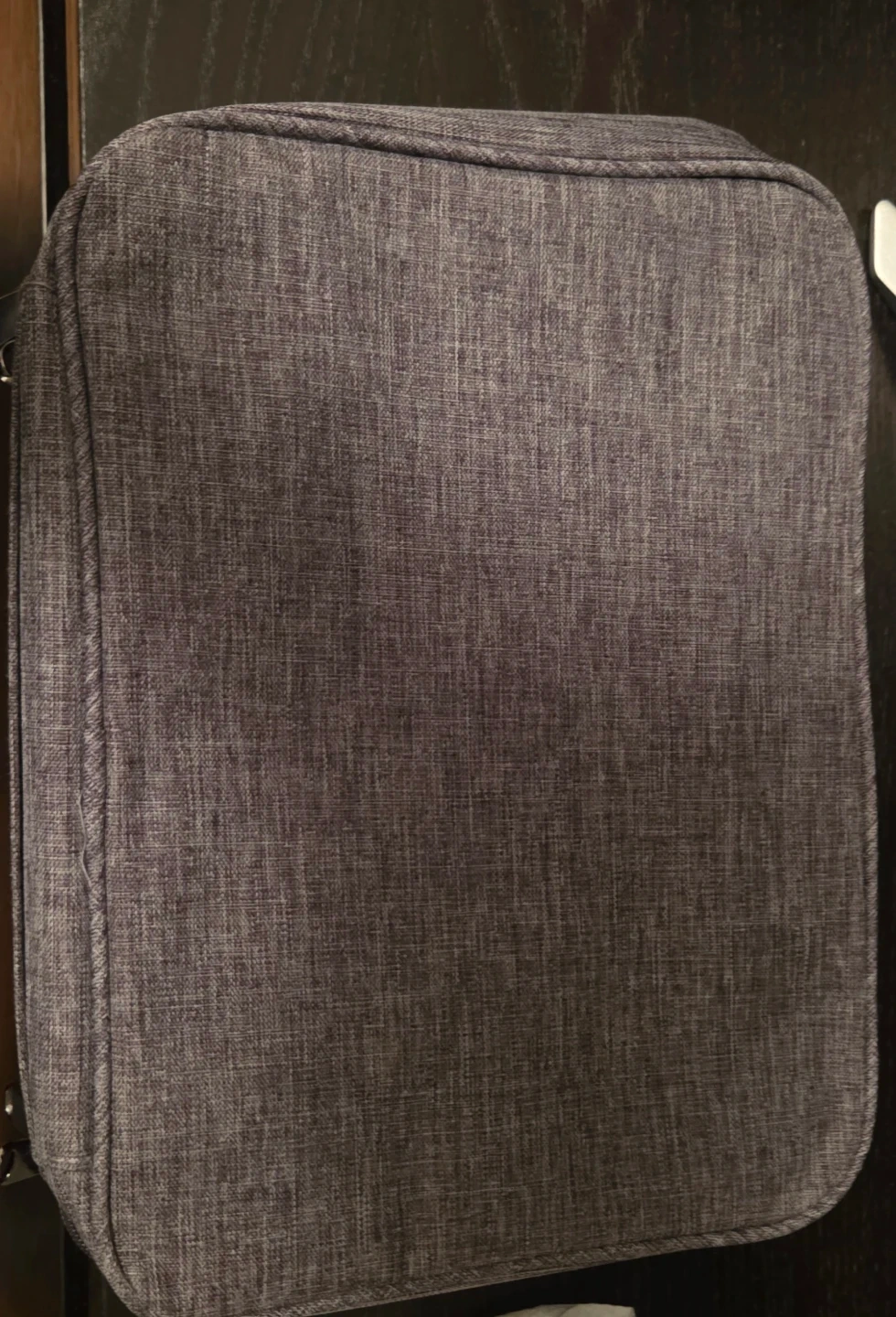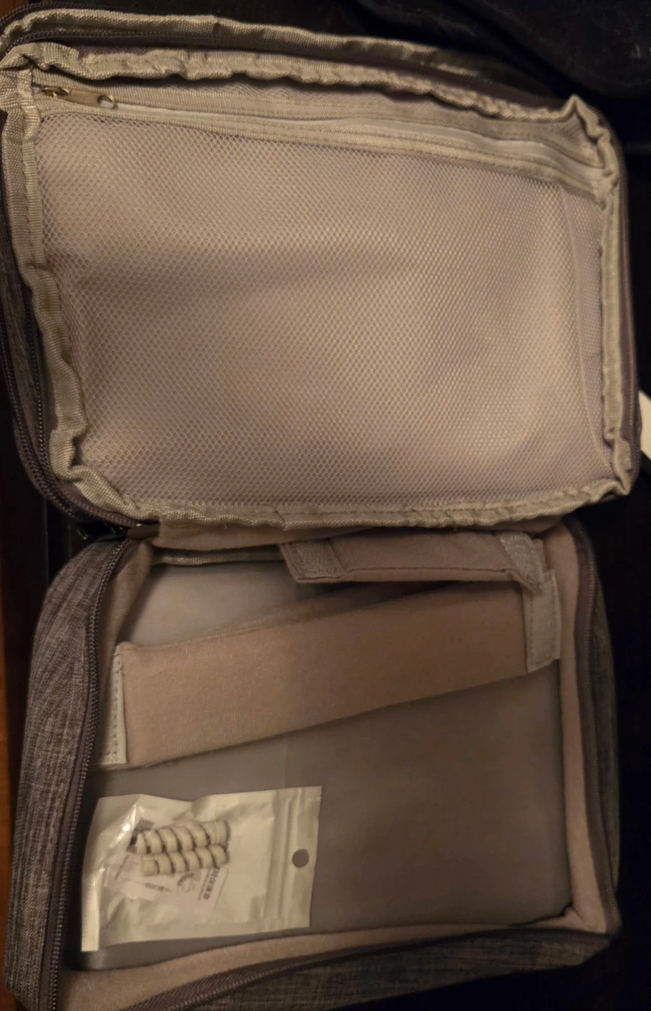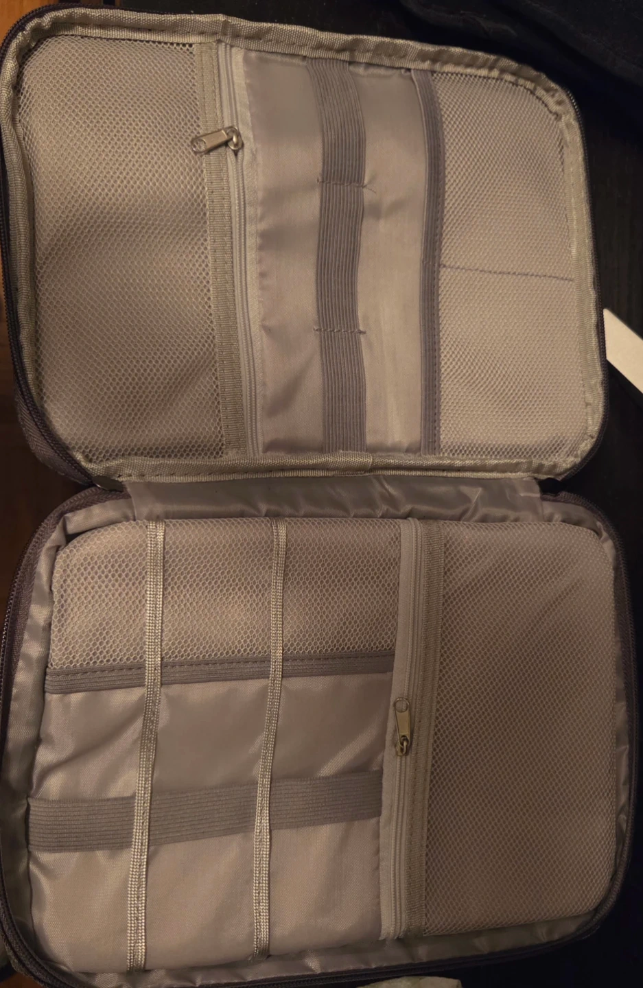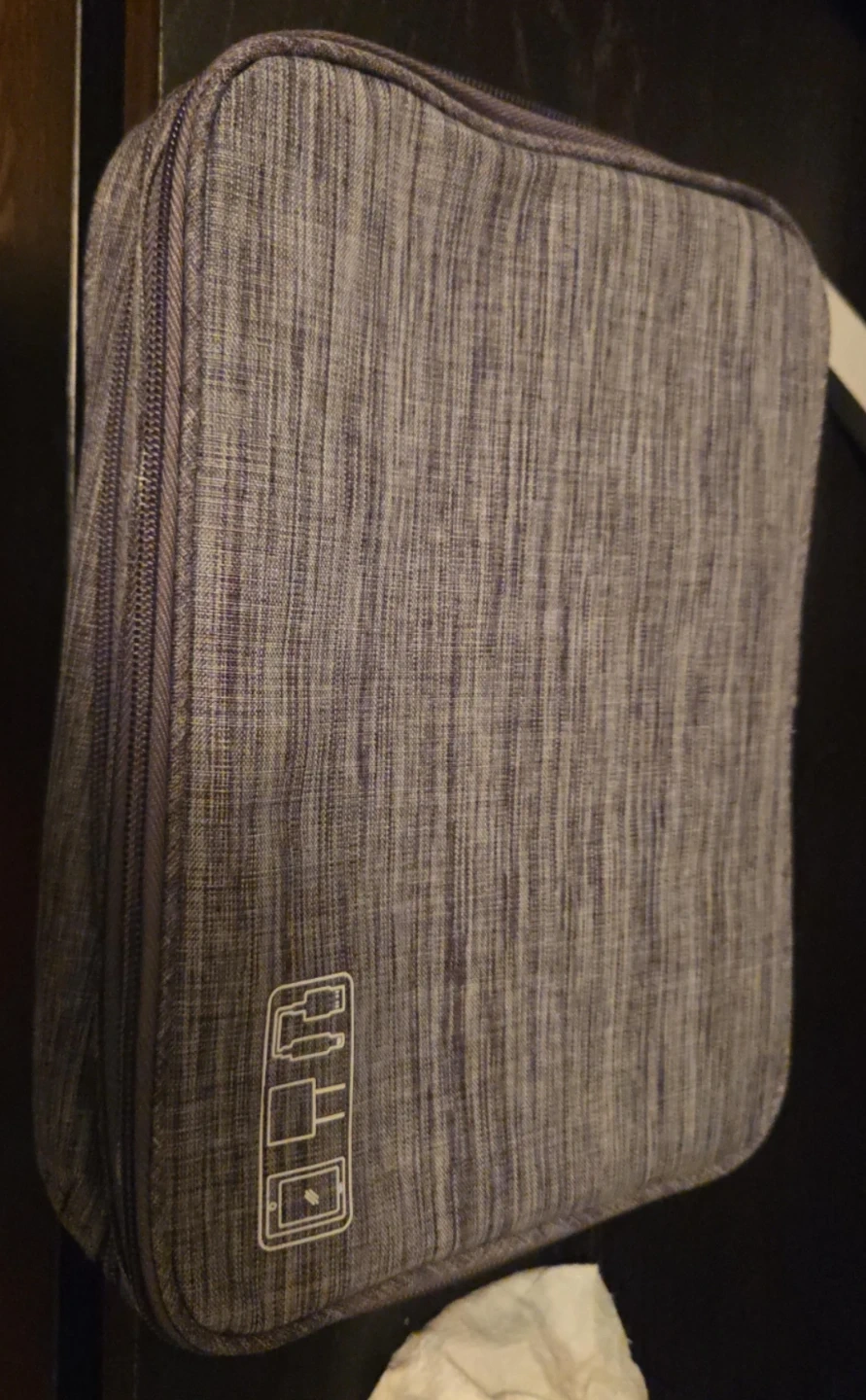 Grey fabric organizer bag for electronics and accessories. It has multiple zippered pockets and elastic straps inside for cables and small items. Great for travel!