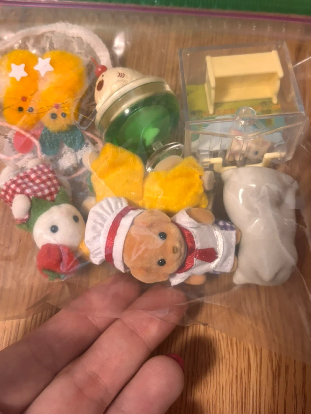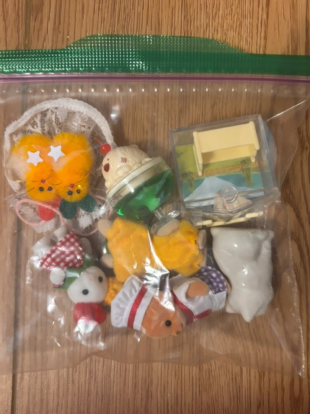 A collection of cute Calico Critters miniature figures and accessories. Includes various animal figures dressed in outfits, furniture pieces, and small accessories. Perfect for imaginative play or expanding a Calico Critters collection!