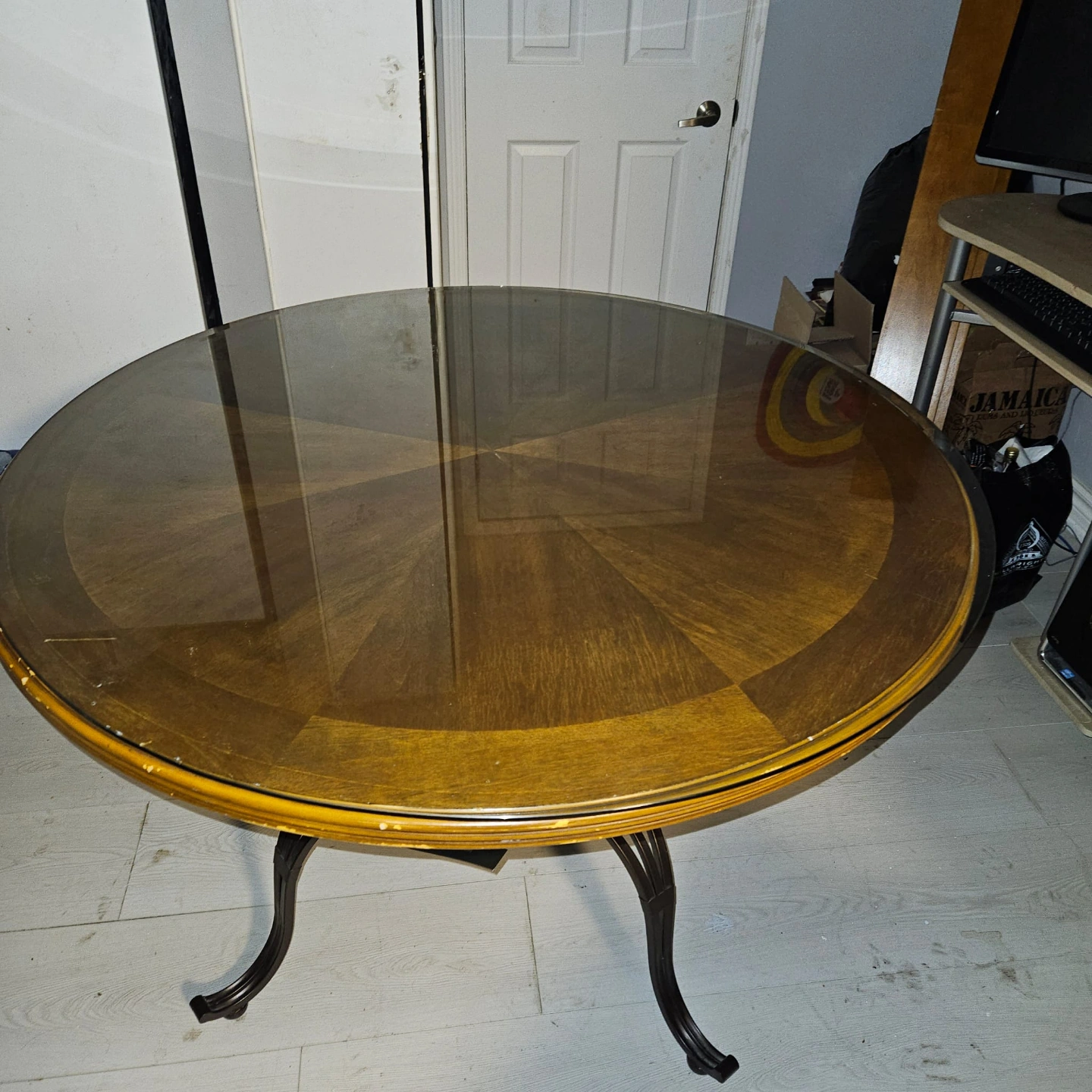 Set includes round glass top dining table and four chairs. Brown wood and metal accents. Brown fabric seats. Good for smaller spaces.