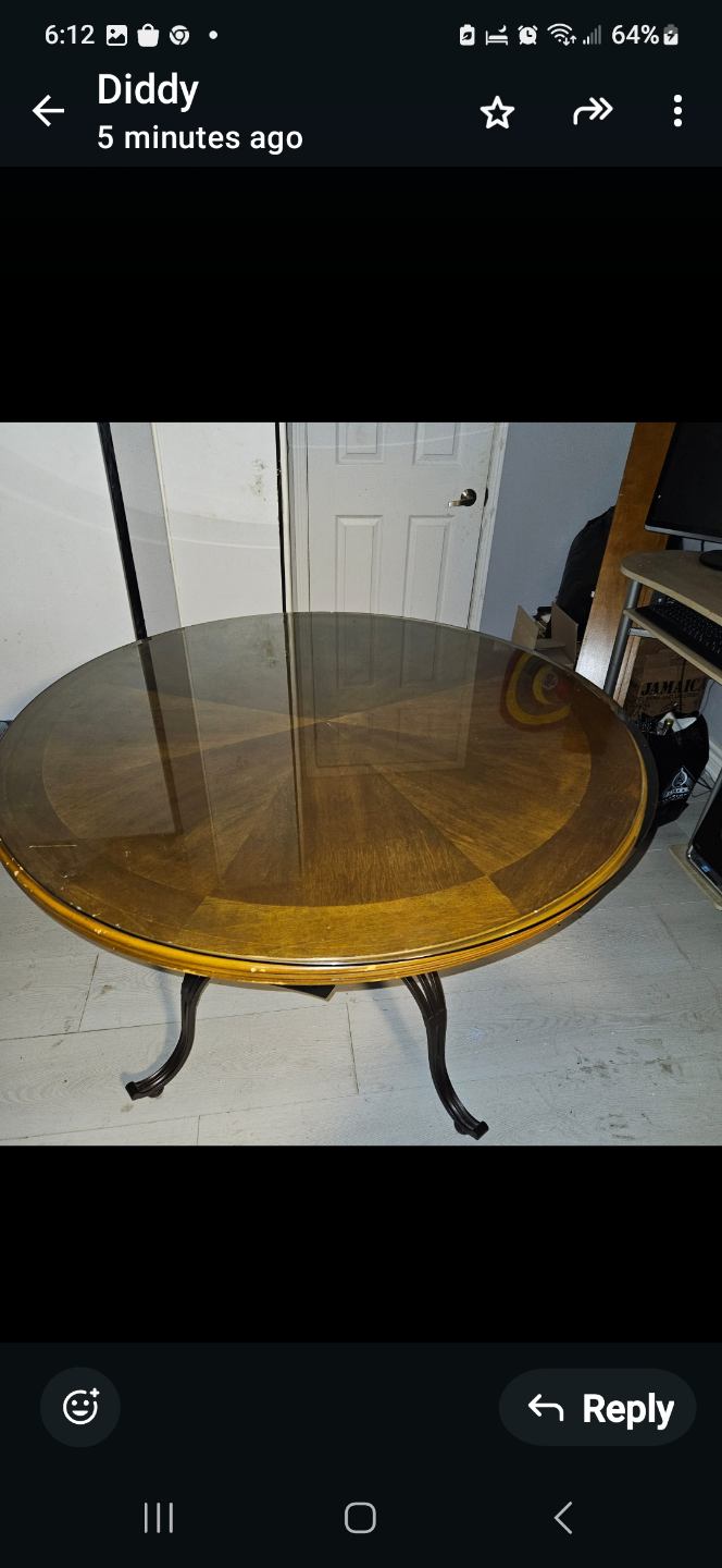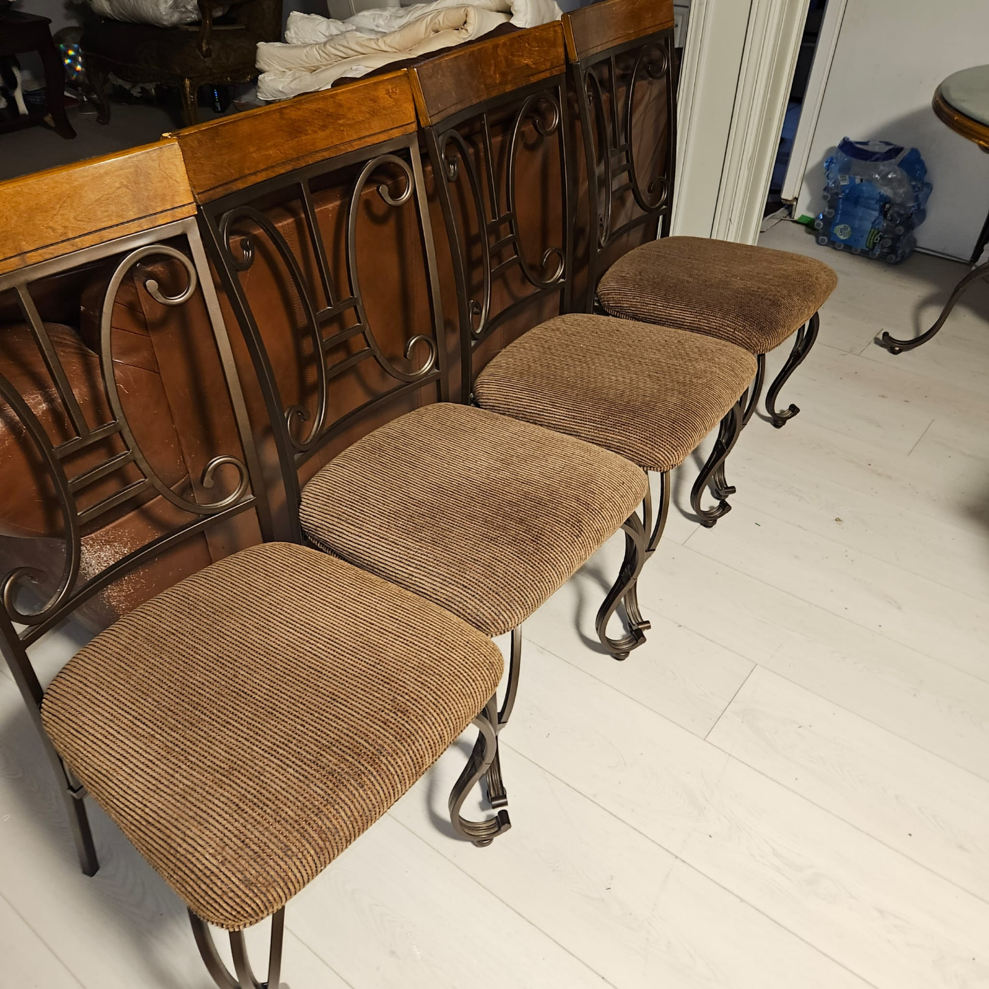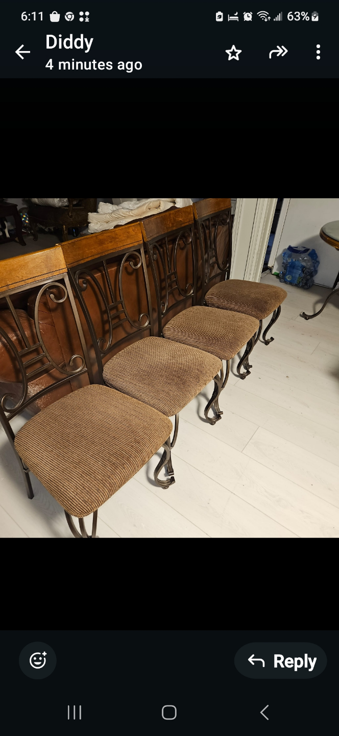 Set includes round glass top dining table and four chairs. Brown wood and metal accents. Brown fabric seats. Good for smaller spaces.