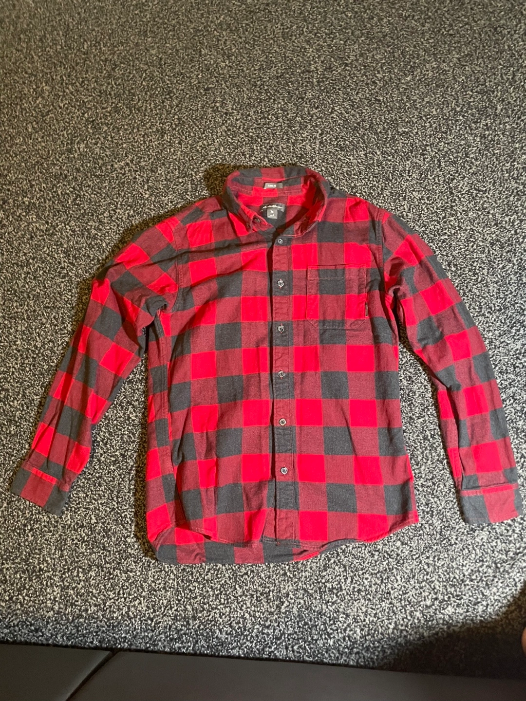 Cozy Eddie Bauer flannel shirt in a classic red and black plaid pattern! It's a men's size small and in great condition. Perfect for layering or wearing on its own! Goes for 65-100 dollars on Eddie Bauer website. Jacket is in good condition.