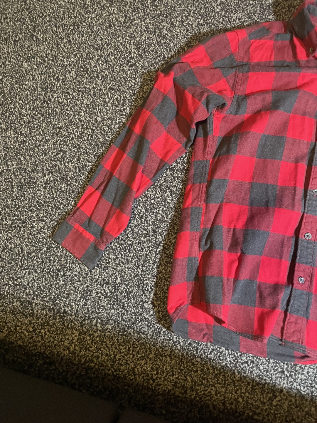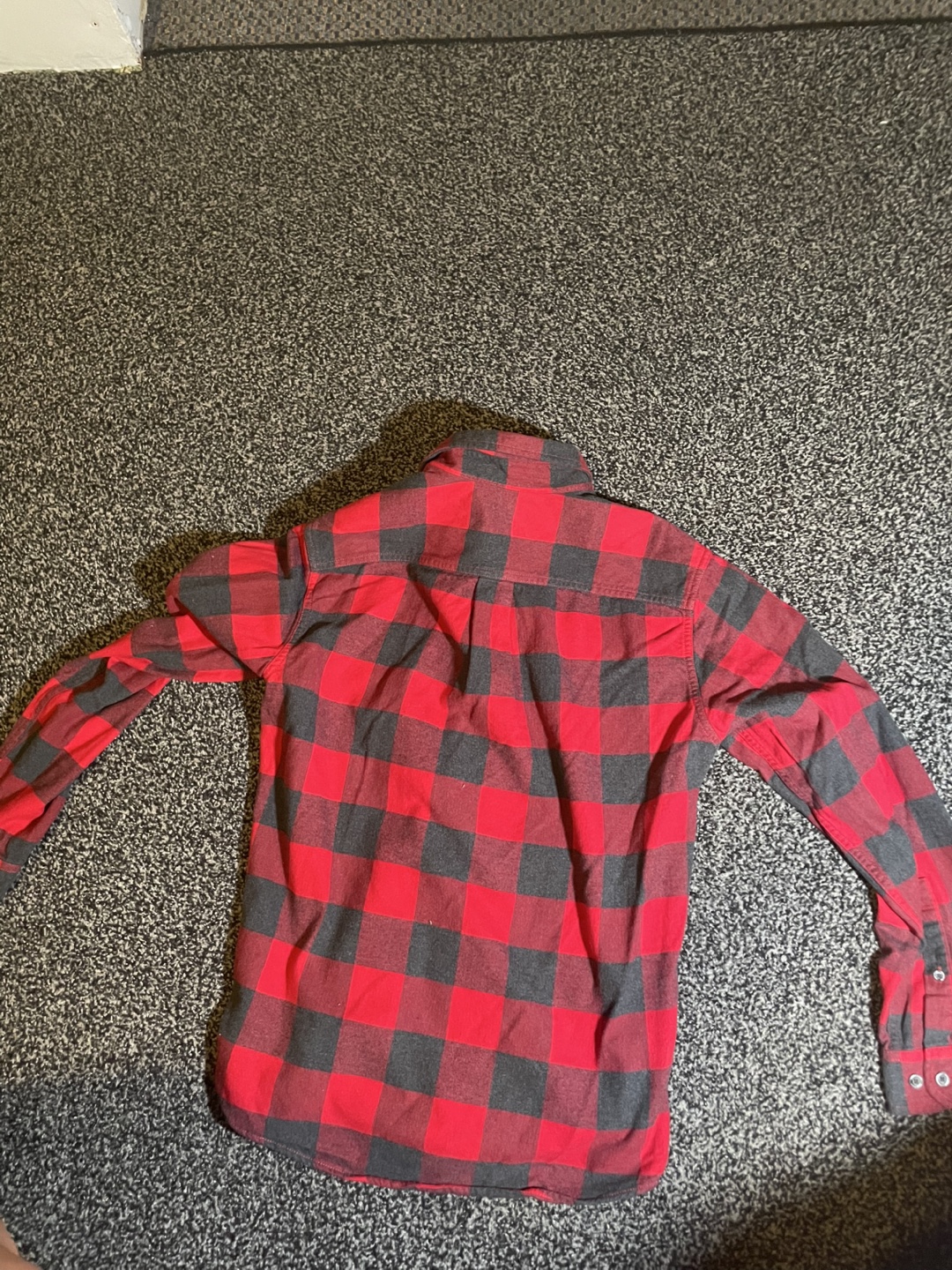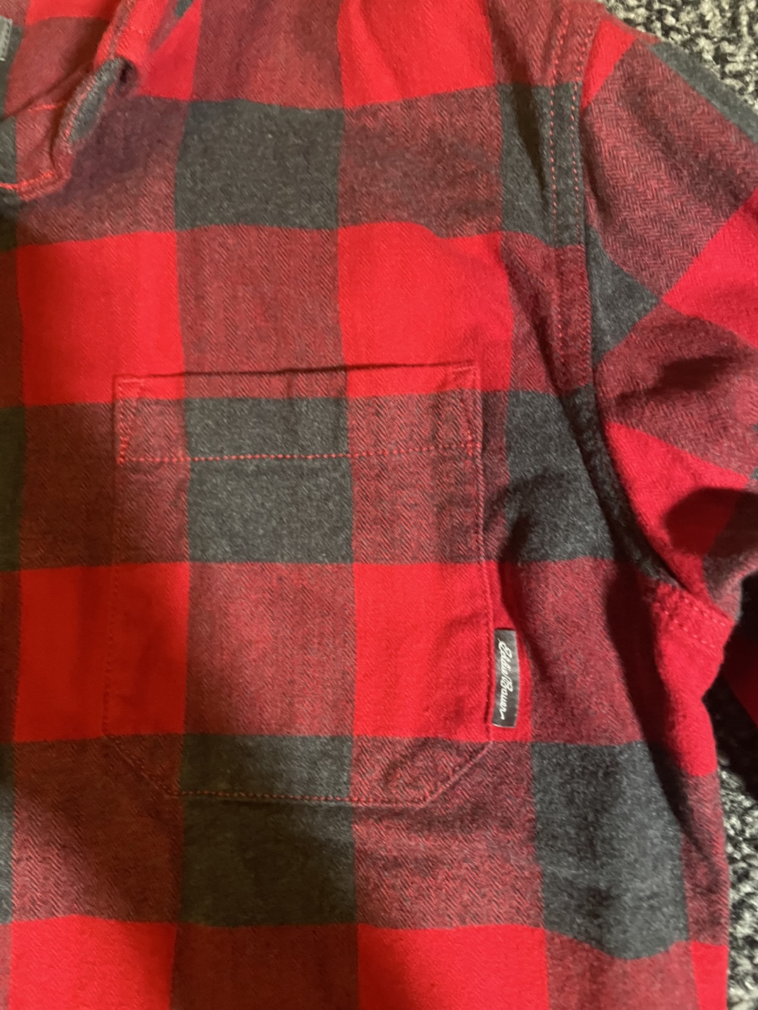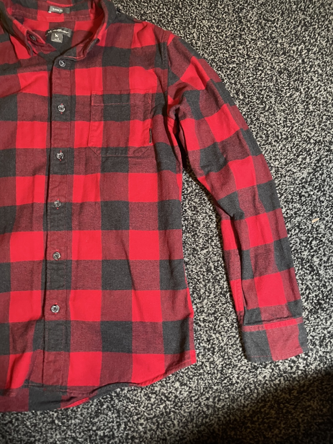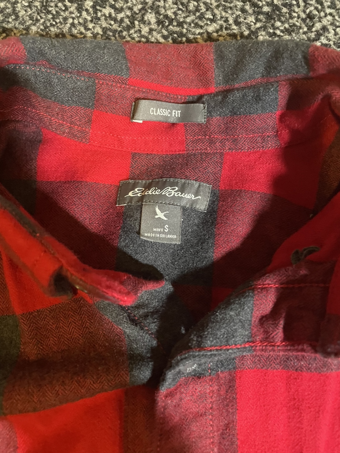 Cozy Eddie Bauer flannel shirt in a classic red and black plaid pattern! It's a men's size small and in great condition. Perfect for layering or wearing on its own! Goes for 65-100 dollars on Eddie Bauer website. Jacket is in good condition.