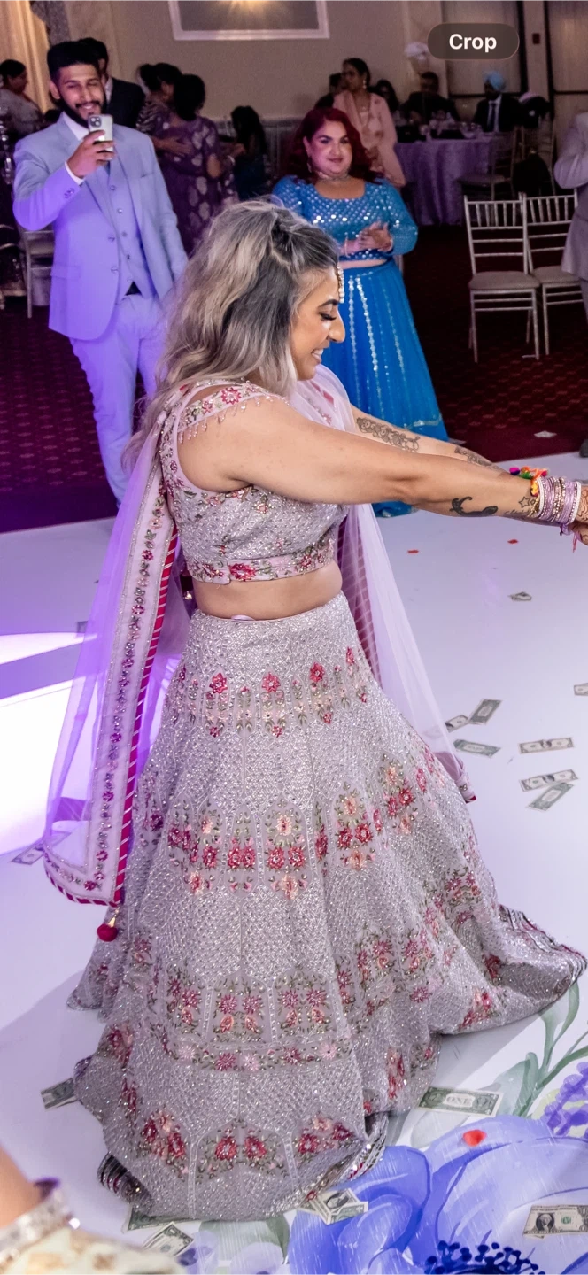 Beautifully embroidered lehenga choli set with intricate floral details and beadwork. The set includes a skirt, blouse, and dupatta. This stunning outfit is perfect for festive occasions and celebrations!