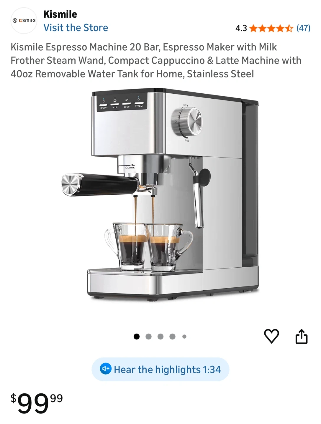 I'm selling a Kismile stainless steel espresso machine with a 20 bar pressure pump. It has a powerful steam wand to make beautiful pulls at home, producing a thick and creamy milk froth in an instant. It features intelligent temperature control to maintain the optimum temperature whether you are making coffee or frothing milk.