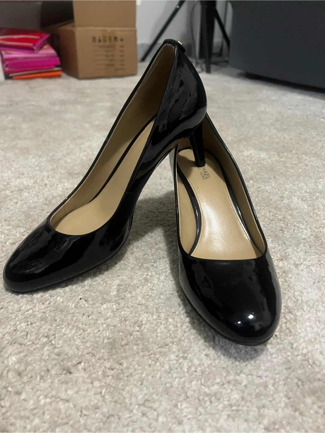 These Michael Kors heels are made with shiny black patent leather. They feature a classic pump design with a comfortable heel height. Perfect for dressing up any outfit!