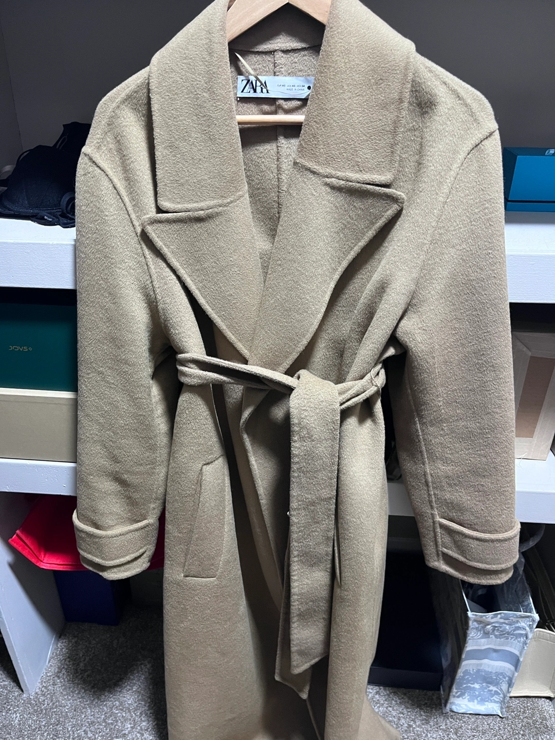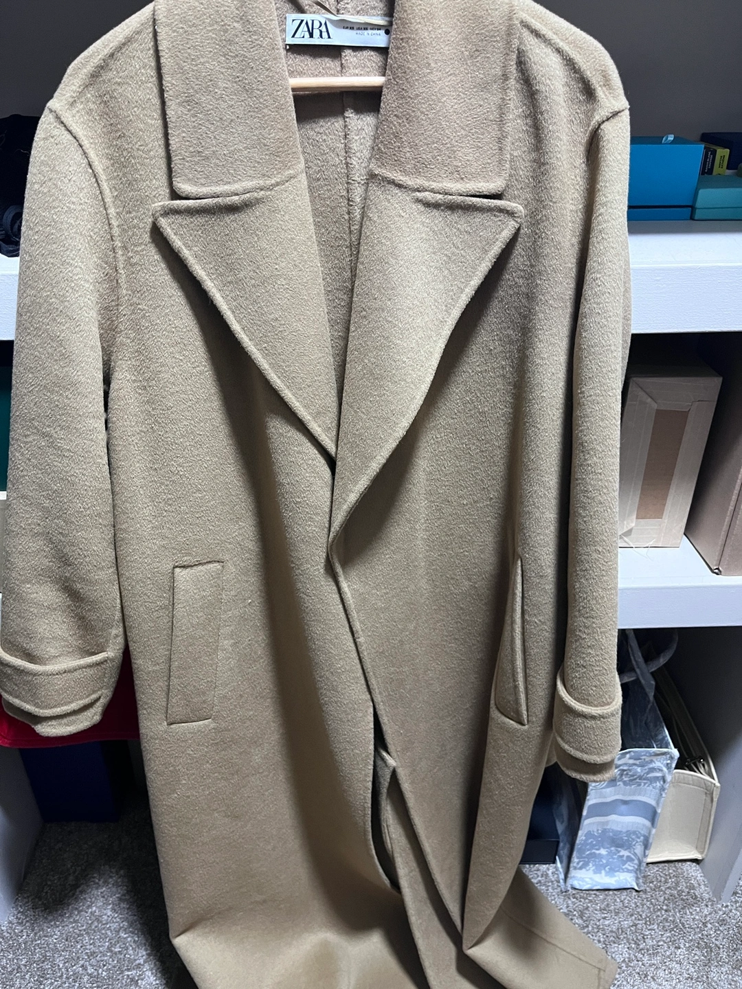 Long, belted coat with a collar and long sleeves. The coat is made of a soft, warm wool blend fabric. It is a timeless and elegant piece that can be dressed up or down. This has only been worn once and it's too long for me.
