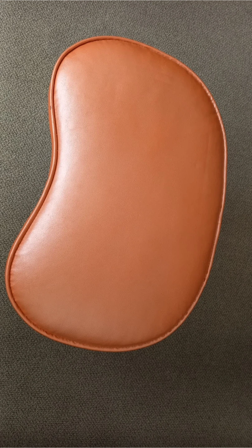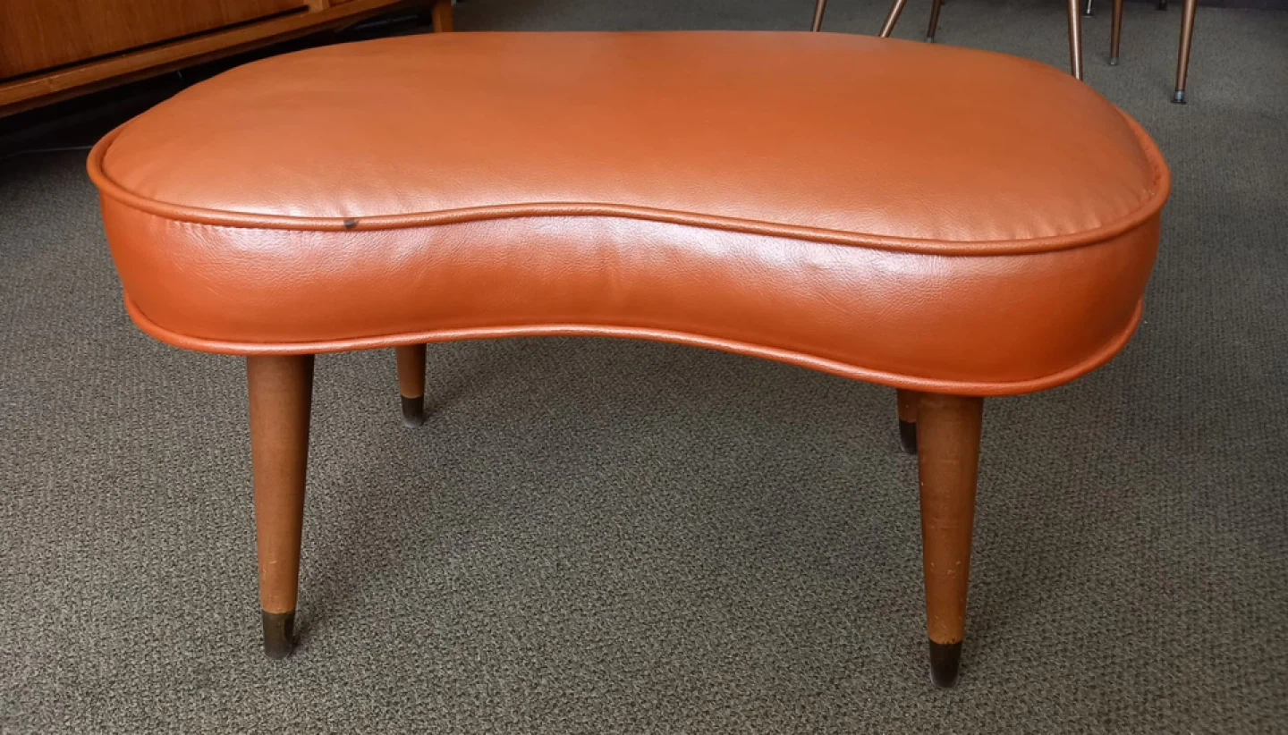 This retro footstool features a kidney bean shape with orange faux leather upholstery. It has wooden legs with metal caps. This ottoman's unique design adds a touch of vintage charm to any space. It's perfect for resting your feet after a long day!