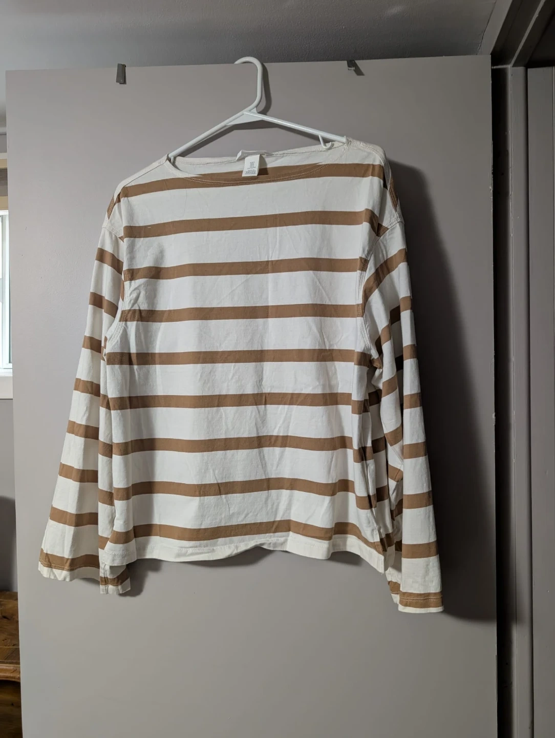 This is an H&M long-sleeve shirt with horizontal brown and white stripes. It's made of cotton. Perfect for casual wear!