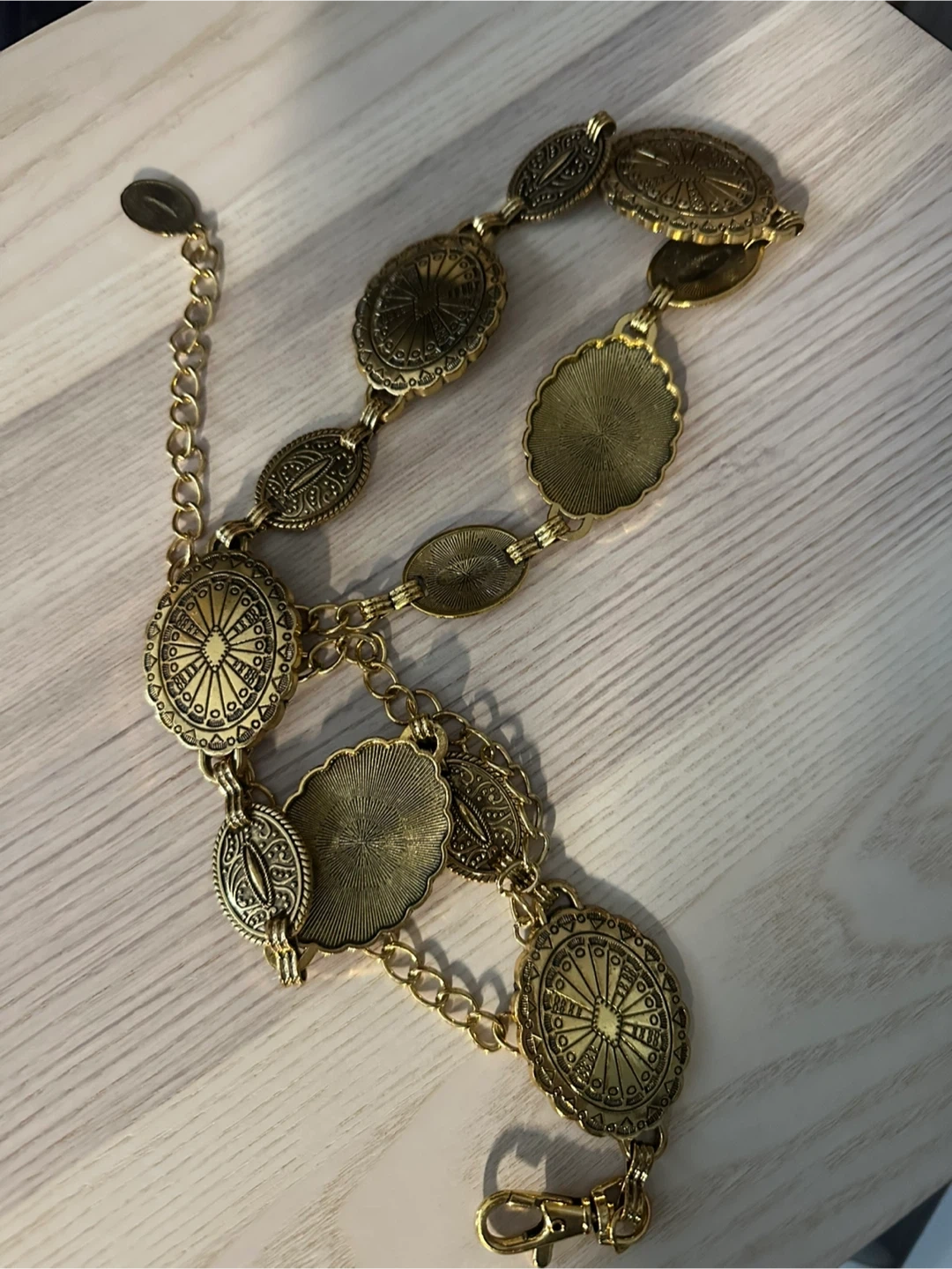 This is a gold tone metal belt with an intricate medallion design. It features an adjustable chain and a lobster clasp closure. It's a statement piece that can add flair to any outfit!