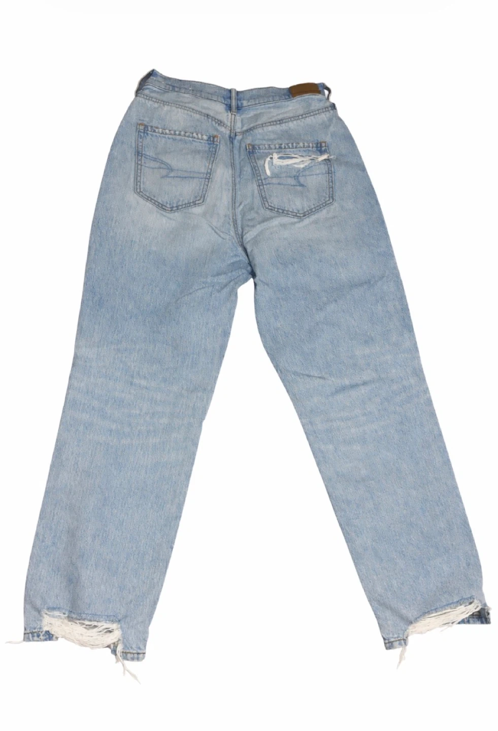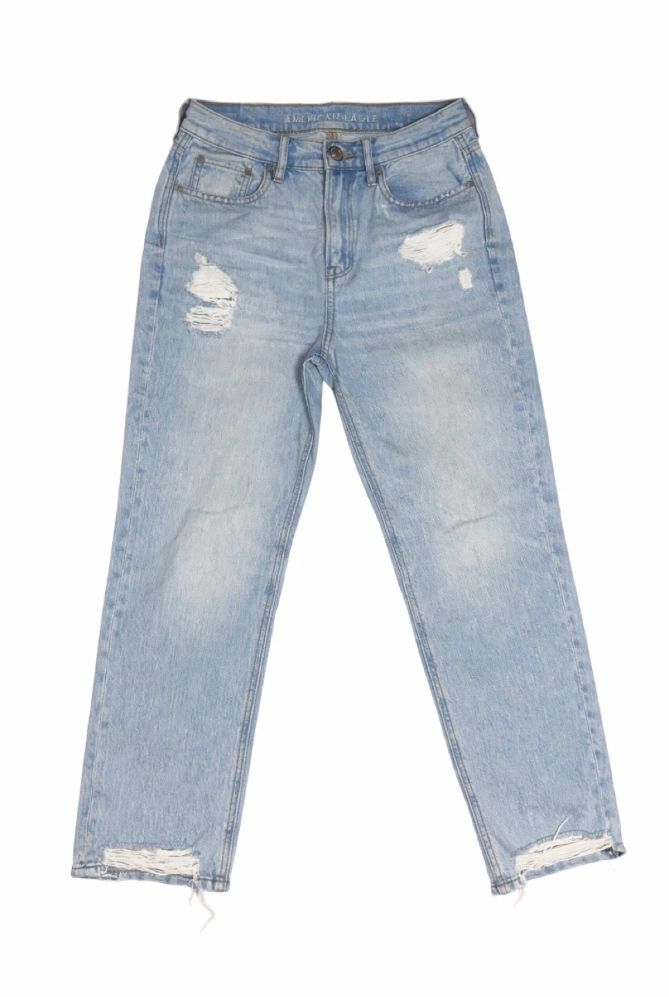 Light wash distressed jeans from American Eagle Outfitters. Features ripped detailing and a relaxed fit. These jeans are made of denim.