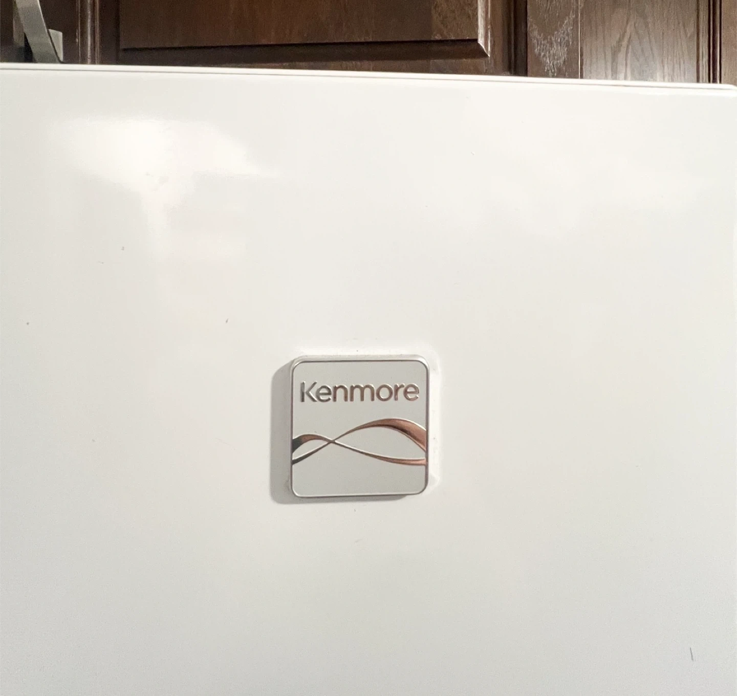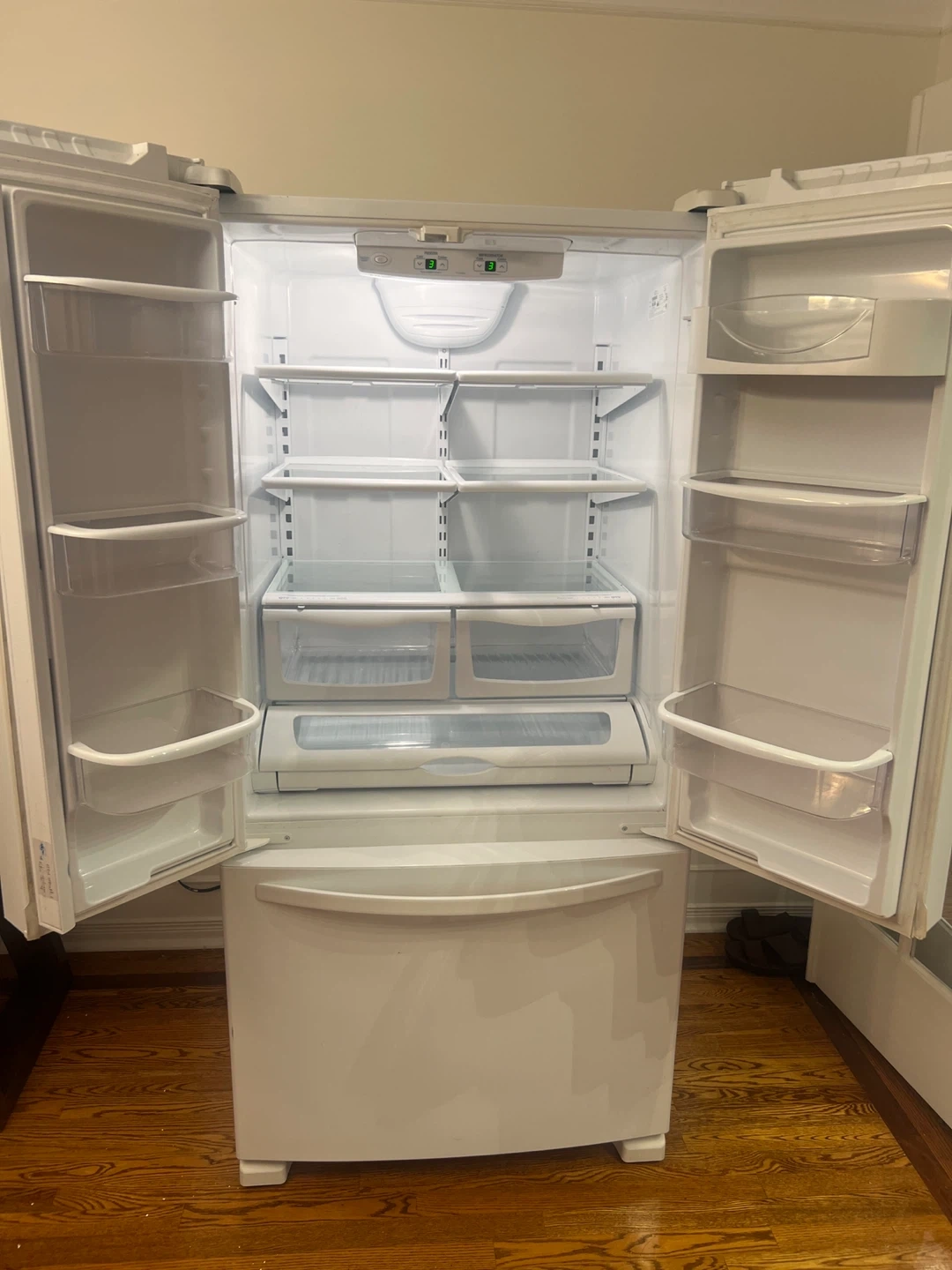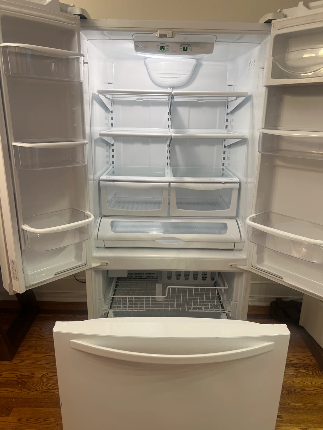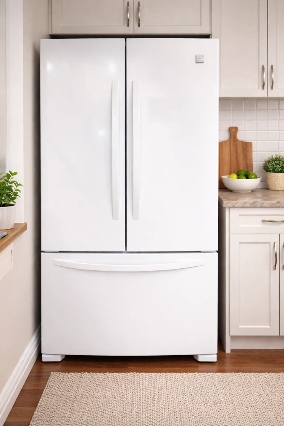White Kenmore french door refrigerator with a bottom freezer drawer. It's a spacious appliance with adjustable shelving and clear door bins. Great for keeping all your groceries fresh and organized!