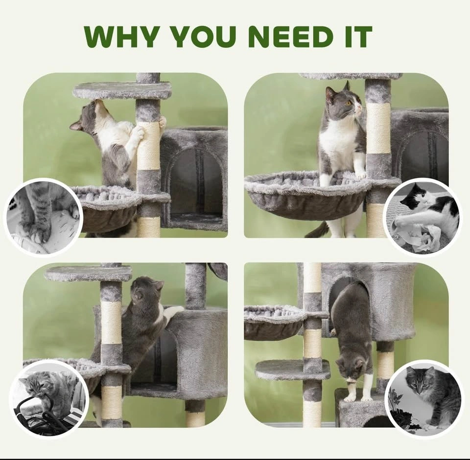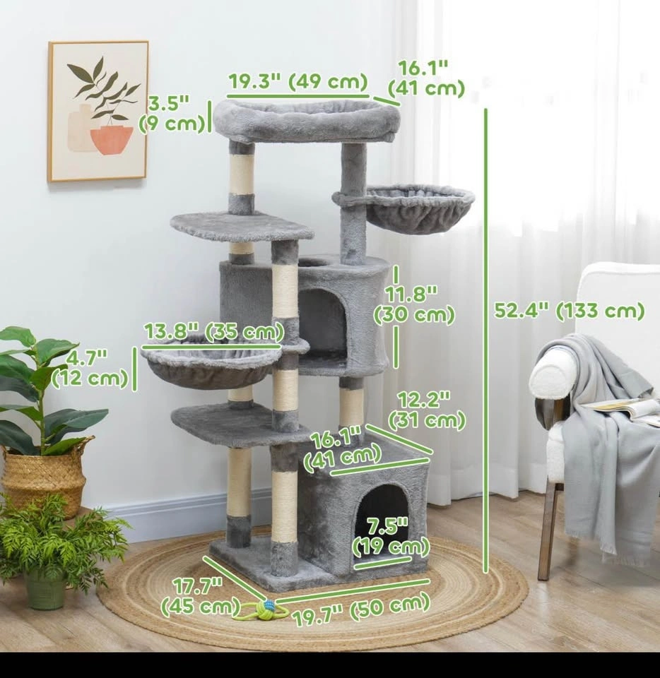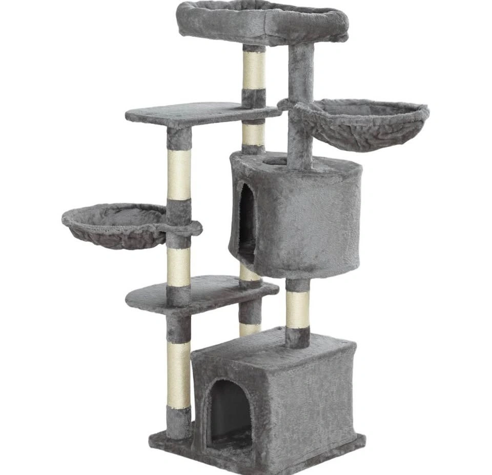 Brand new assembled 52.5" cat tree tower with scratching posts, cat condos, bed, platforms, and hammocks. Perfect for indoor cats. Grey color.