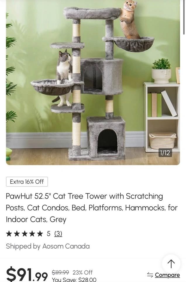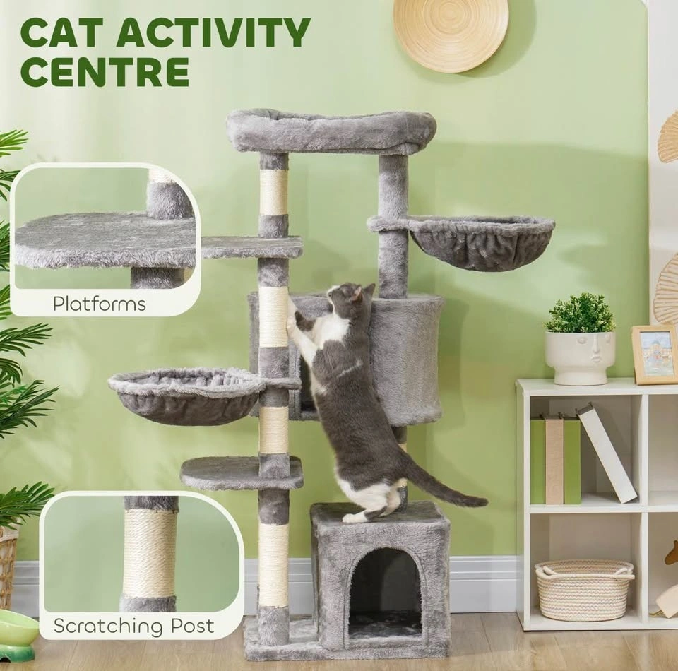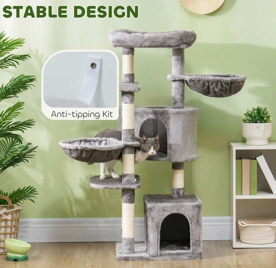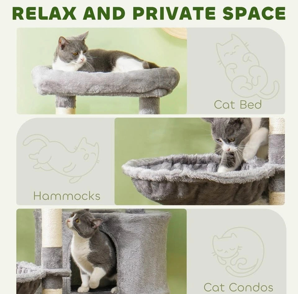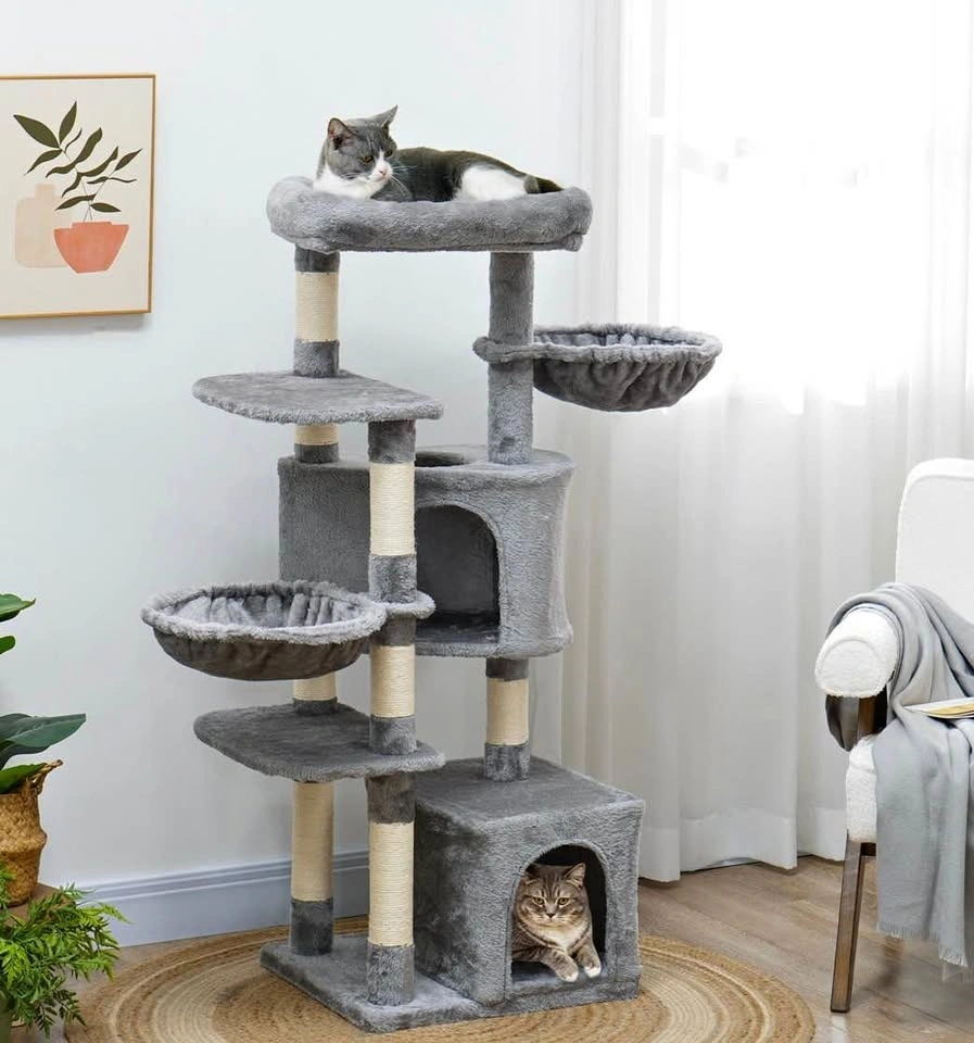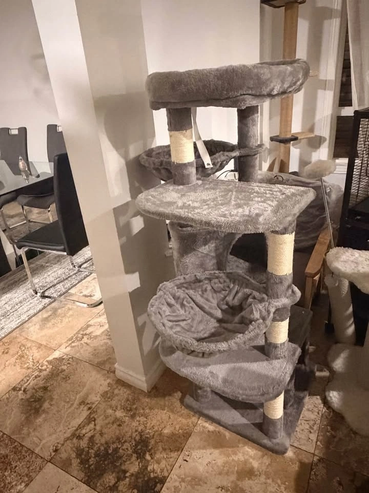 Brand new assembled 52.5" cat tree tower with scratching posts, cat condos, bed, platforms, and hammocks. Perfect for indoor cats. Grey color.