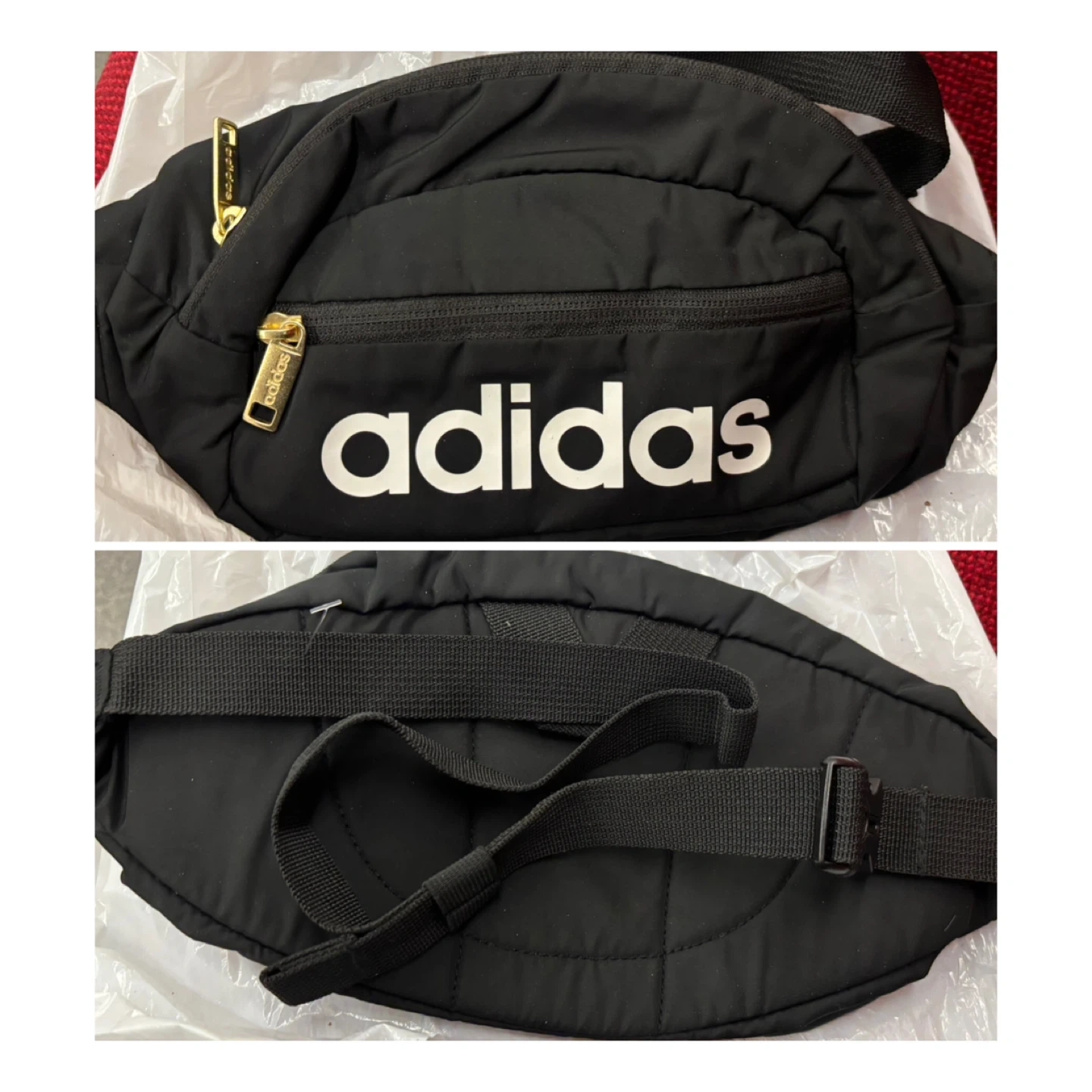 For free is a black Adidas fanny pack with white logo detailing. It has a zippered main compartment and an adjustable strap with a buckle closure. Nylon material.