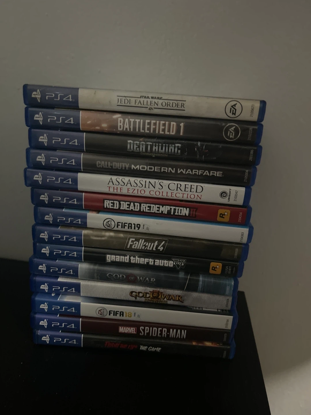 PlayStation 4 games. Titles include Star Wars Jedi: Fallen Order, Battlefield 1, Deathwing, Call of Duty: Modern Warfare, Assassin's Creed Ezio Collection, Red Dead Redemption II, FIFA 19, Fallout 4, Grand Theft Auto V, God of War, FIFA 18, Marvel's Spider-Man Games are for PS4.