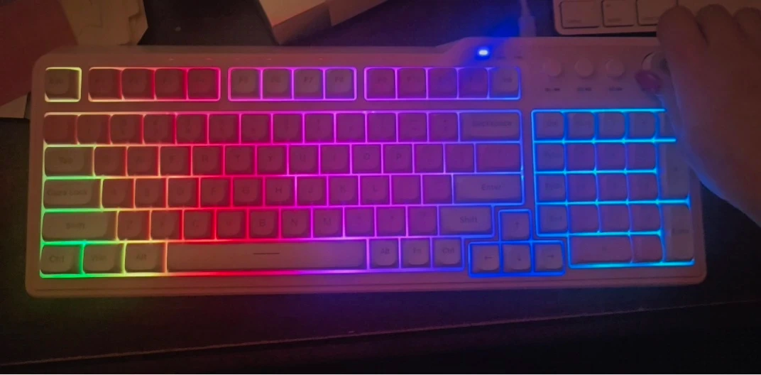 This is a pink AULA F3099 mechanical keyboard with a colorful glowing backlight that can be on or off. It includes a USB cable to charge, keyboard works wirelessly over bluetooth.