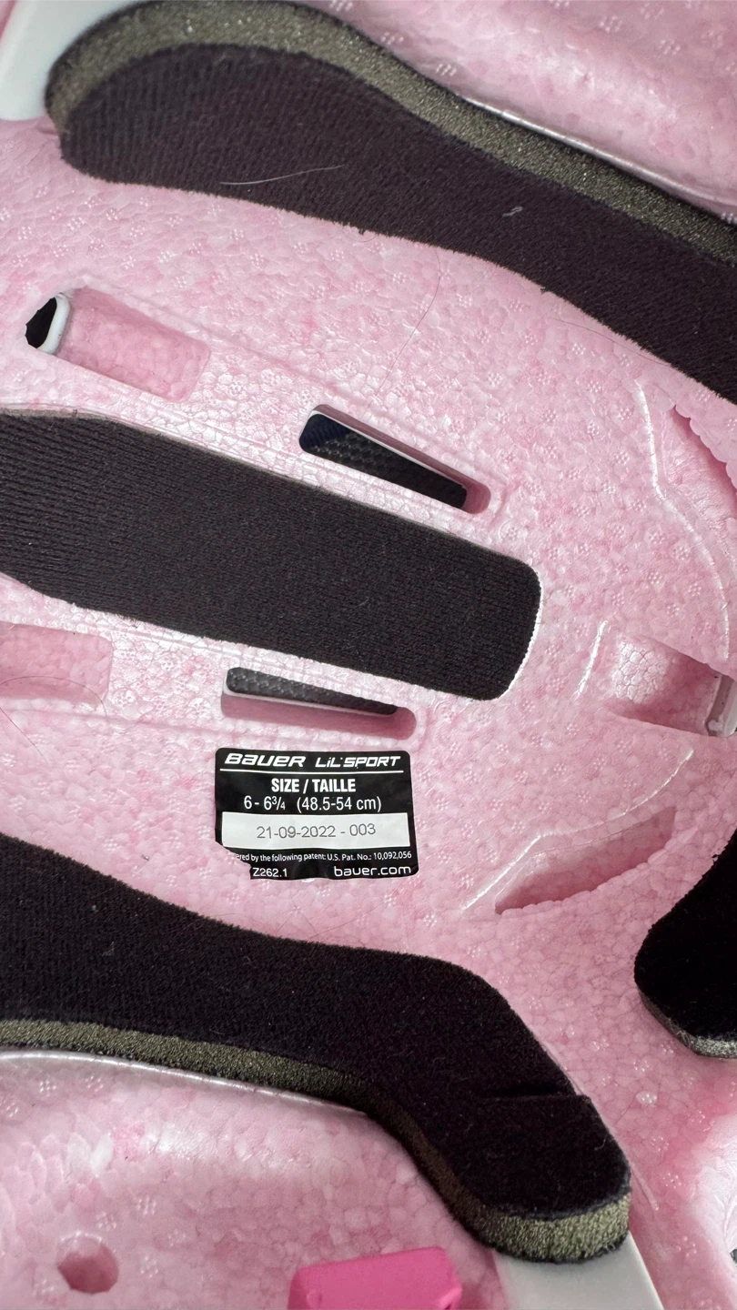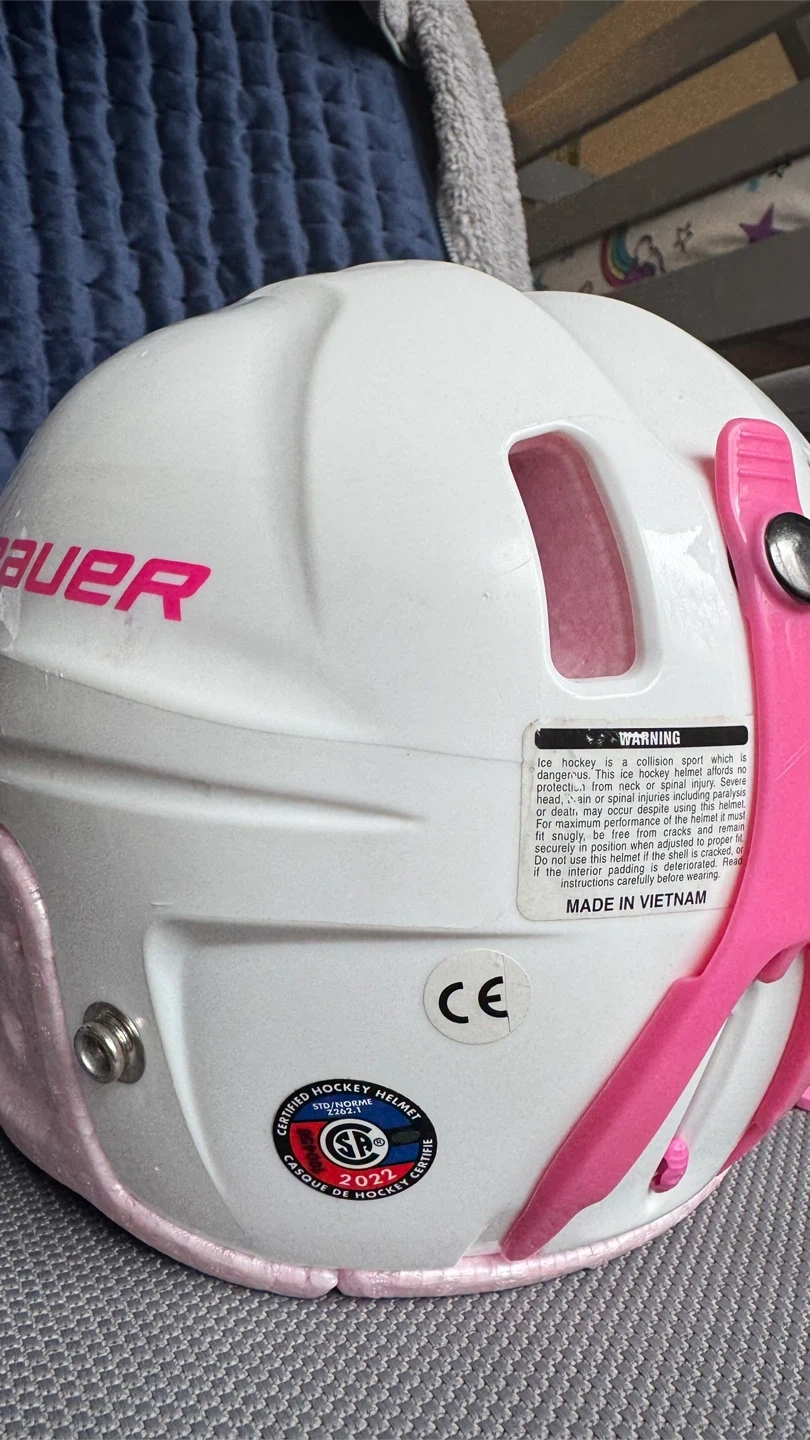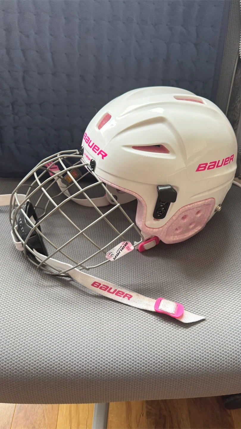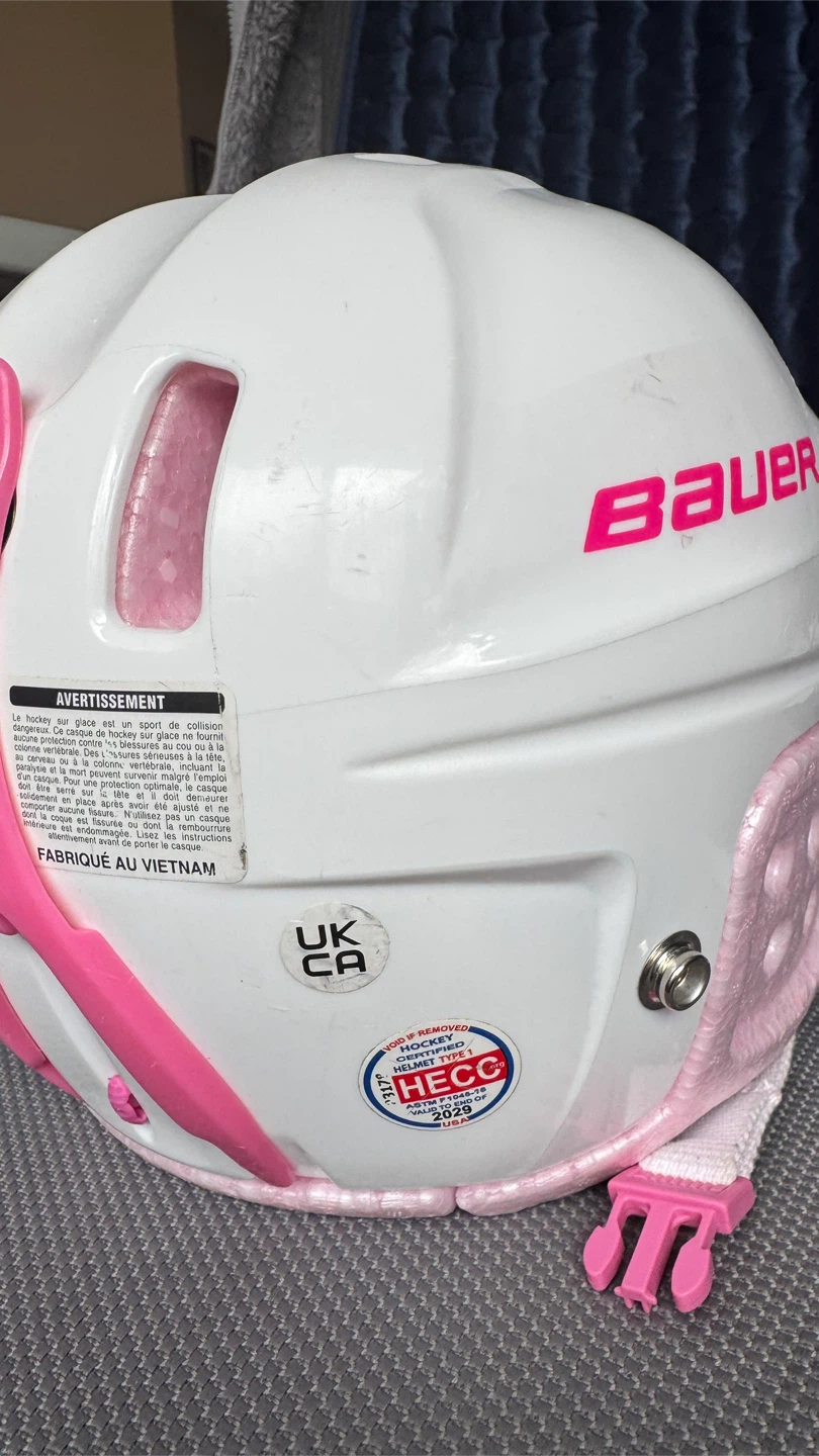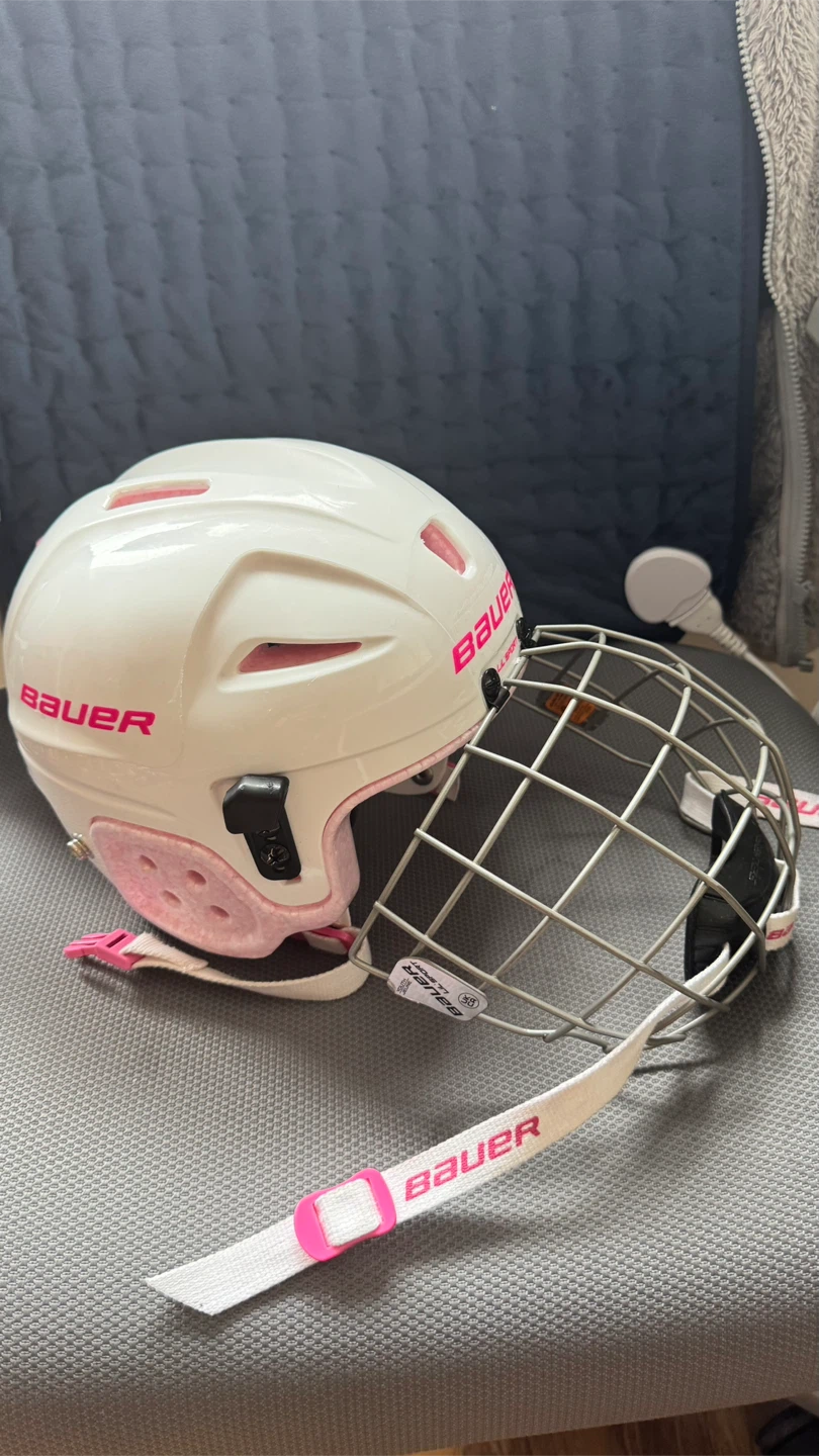 White Bauer hockey helmet with pink trim. Includes a silver cage and adjustable chin strap. Certified hockey helmet.