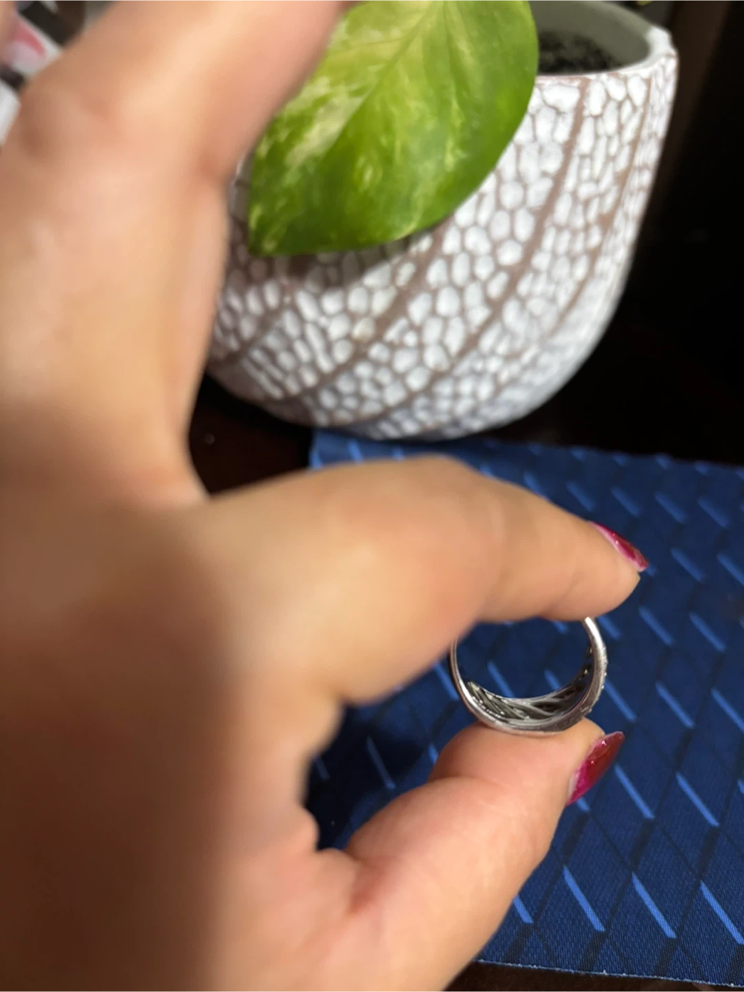 This ring features a detailed woven design with small, sparkling stones set in a silver-tone metal. It's a beautiful statement piece. The band has a substantial feel to it.