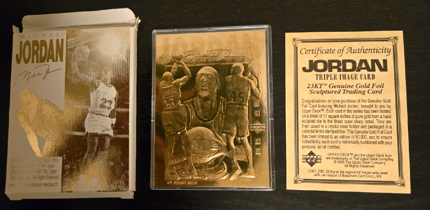115Selling a Michael Jordan Triple Image Card, made of 23KT Genuine Gold Foil.Chicago Bulls. It's a sculpted trading card from Upper Deck. This card is part of a limited edition of 50,000, and each card is individually numbered with your personal serial number. Comes with a Certificate of Authenticity and the original box