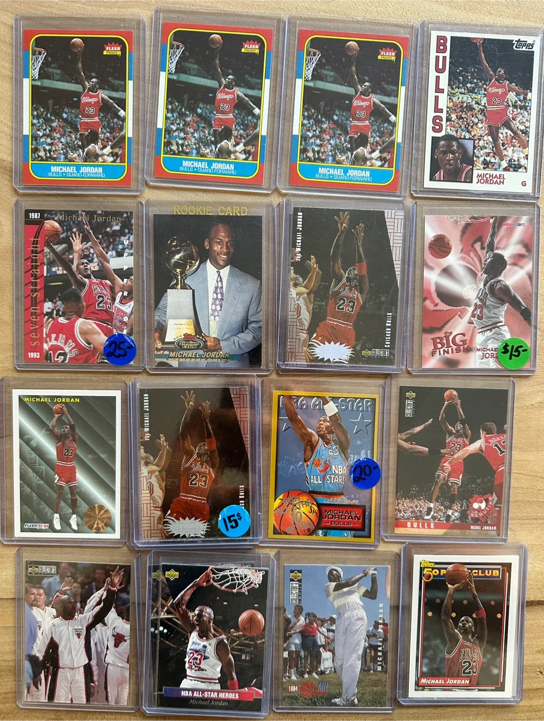 15For Sale: Selling a collection of Michael Jordan basketball cards & Stickers Packs. Includes various cards from different years and sets, featuring iconic moments and designs. Great for any basketball or MJ fan! Please note the Rookie Cards are Reprint Cards from 1986. Please contact me for prices on any card or cards of interest.
