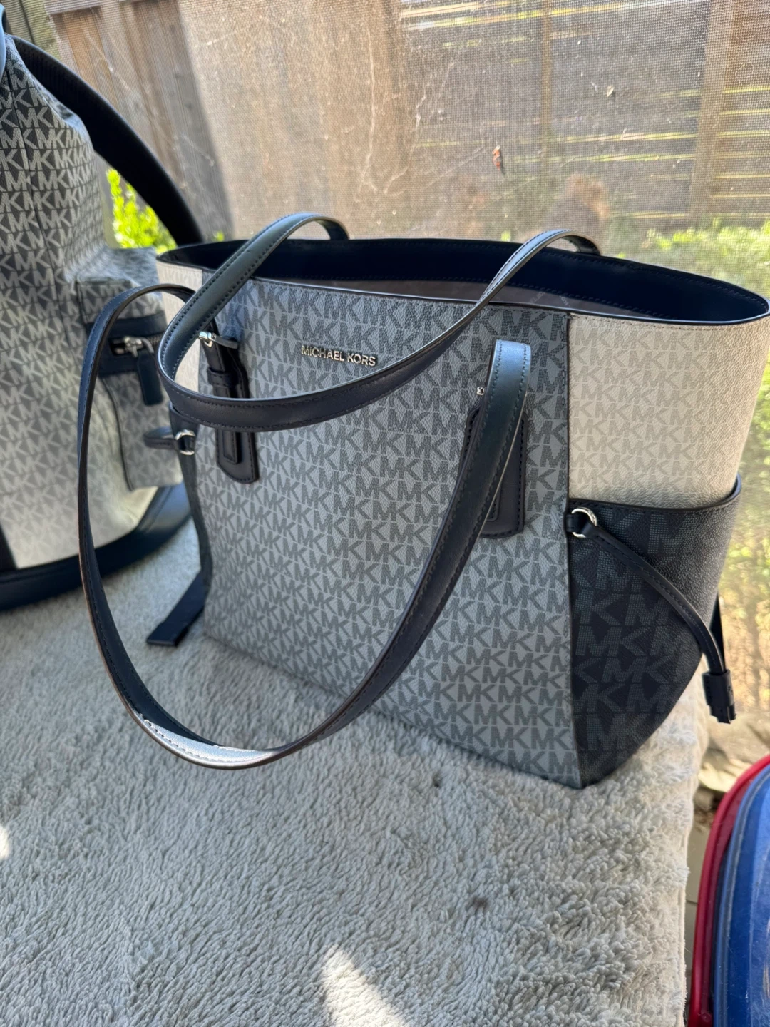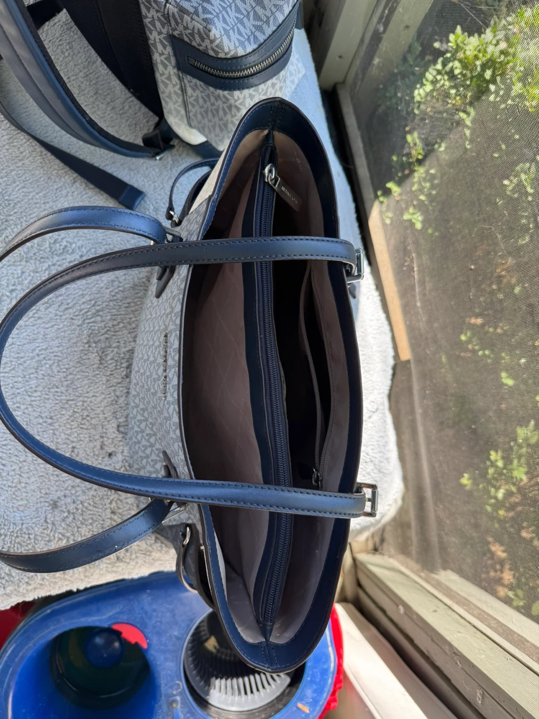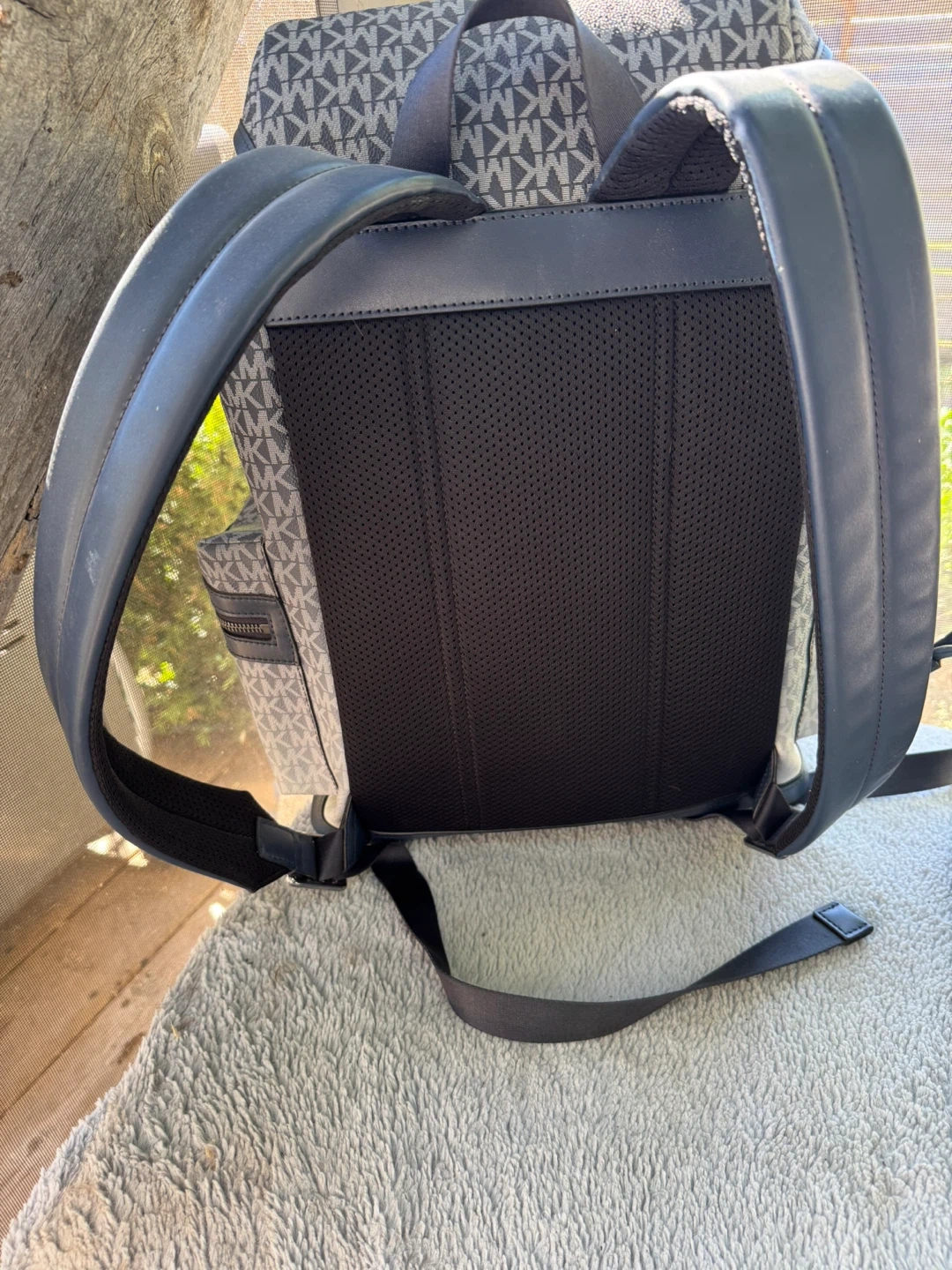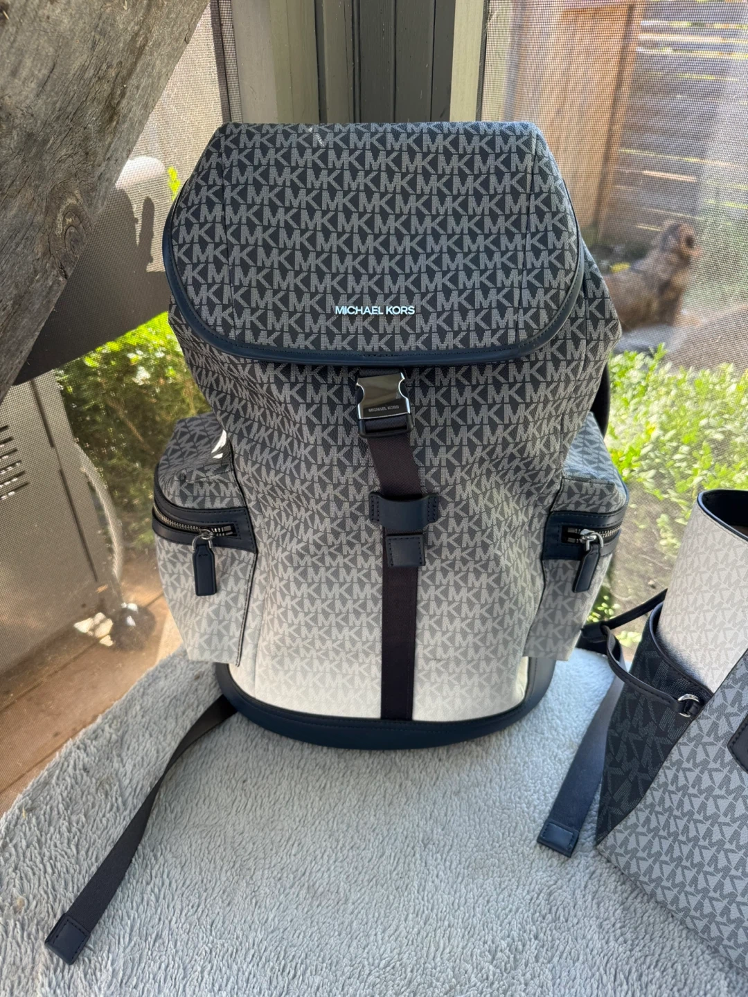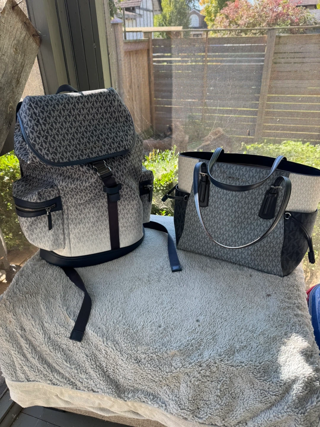 Selling a Michael Kors backpack and tote bag set. Both items feature the signature MK logo pattern in grey and white. The tote bag has navy blue trim and handles. Great for work, school, or travel!