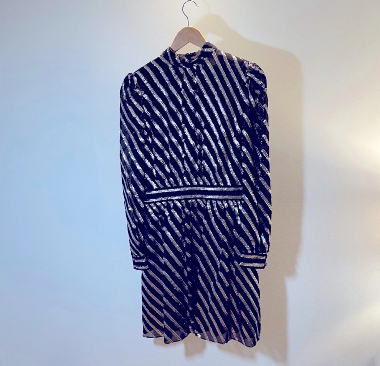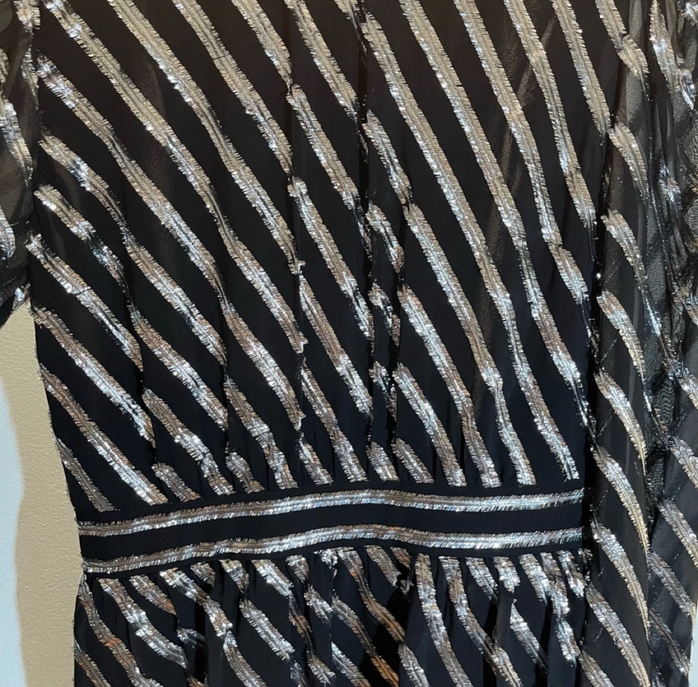 Micheal Kors Black and Silver Long Sleeve Silk dress it up with high heel or down with ankle boots or cute sneakers 83% silk and 17% metallic Size 6 paid $350 plus tax Stunning mini dress. Features long sleeves, a mock neck, and a fitted silhouette. Black fabric with silver stripes. Perfect for a party or special occasion.