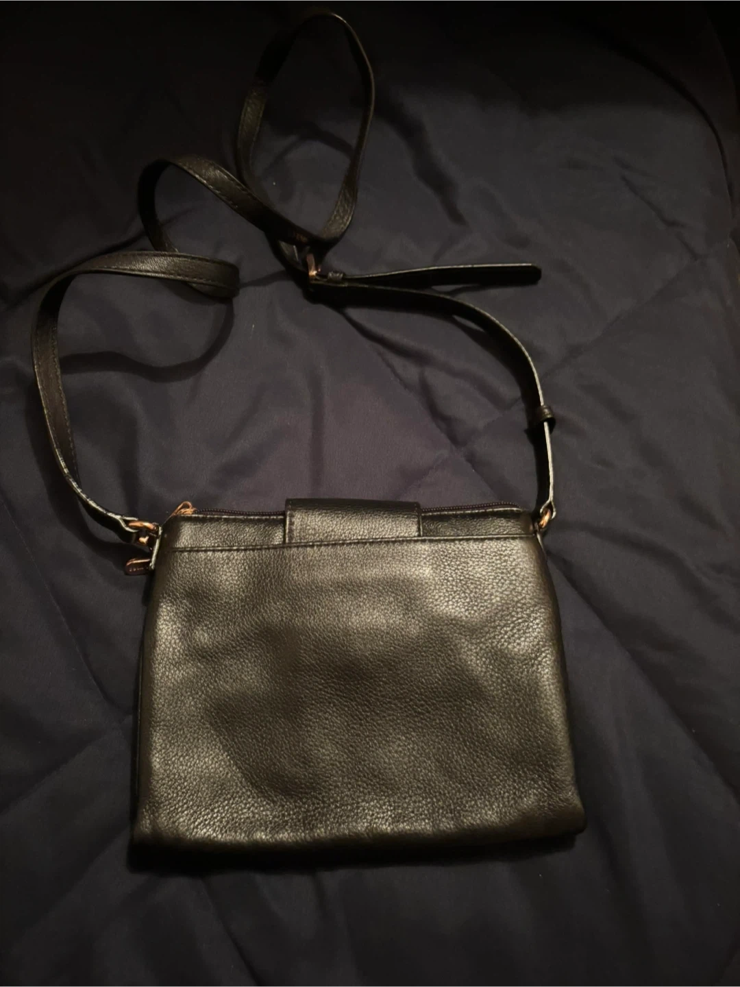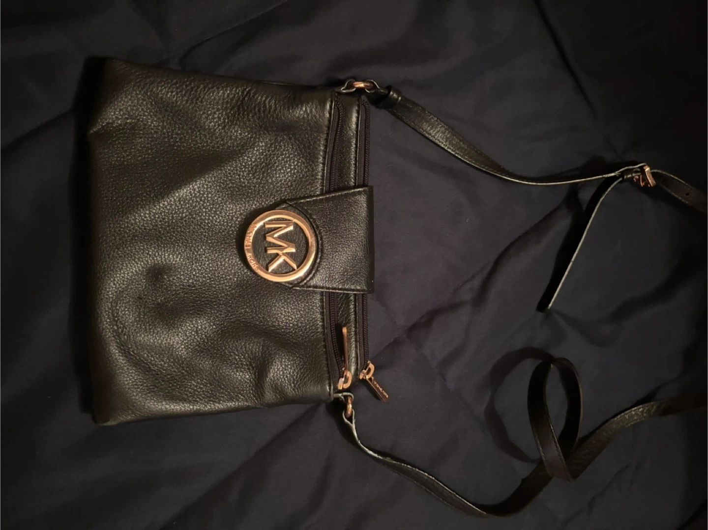 176This is a Michael Kors black leather crossbody bag. It's in great condition and perfect for everyday use! The bag features a sleek design with a gold MK logo. It's a stylish and practical accessory to keep your essentials organized