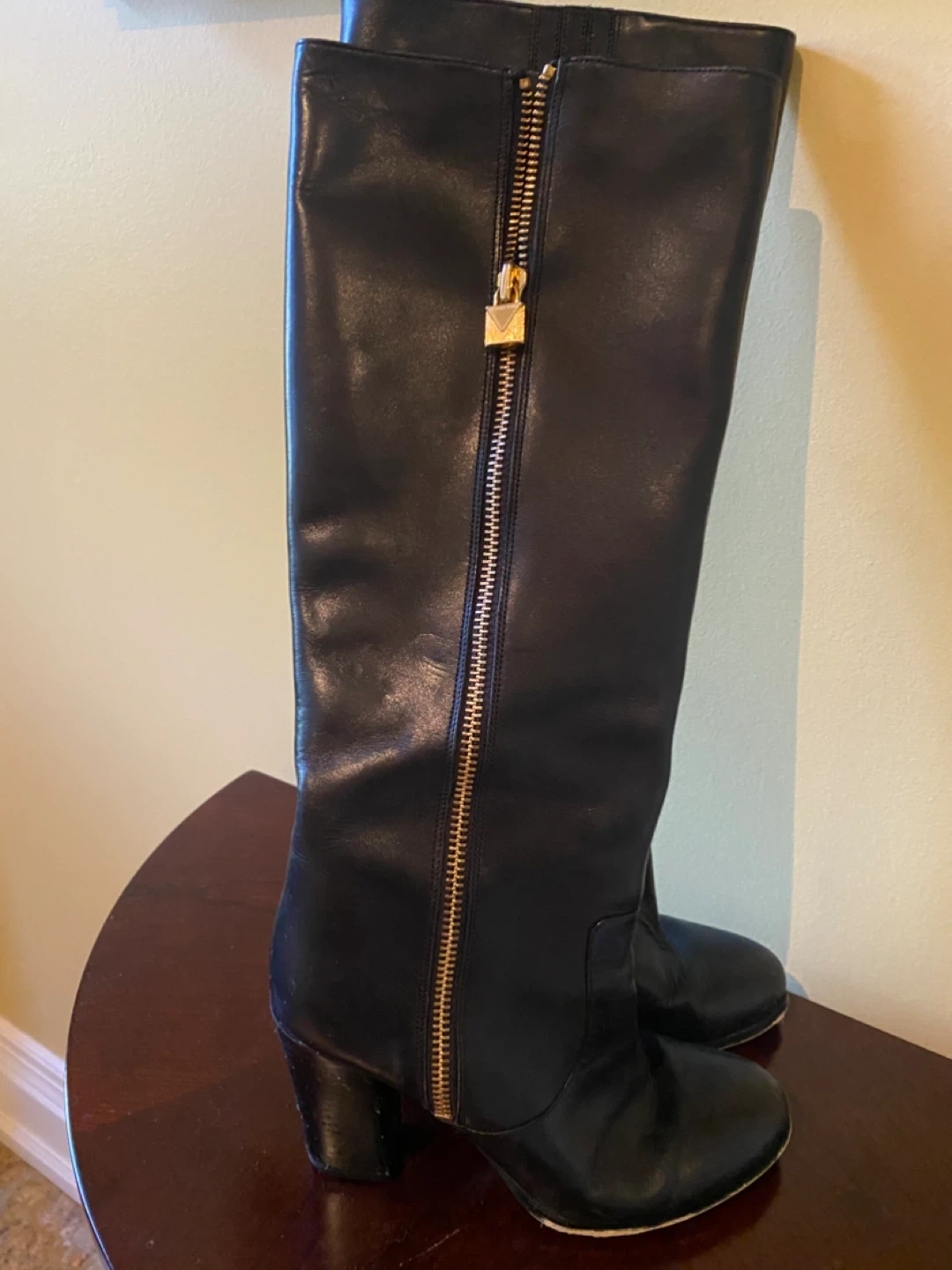 These are a pair of Michael Kors knee-high boots in black leather. They feature a gold zipper detail down the front. They are in good condition and ready for a new home!