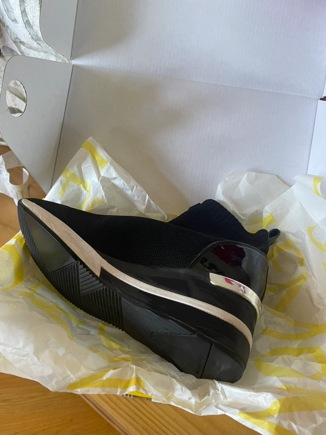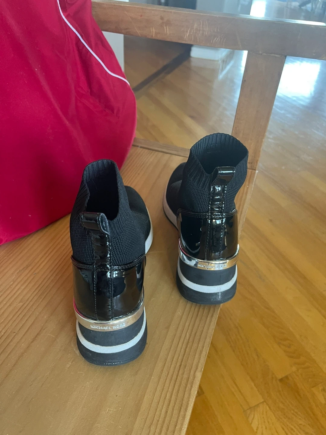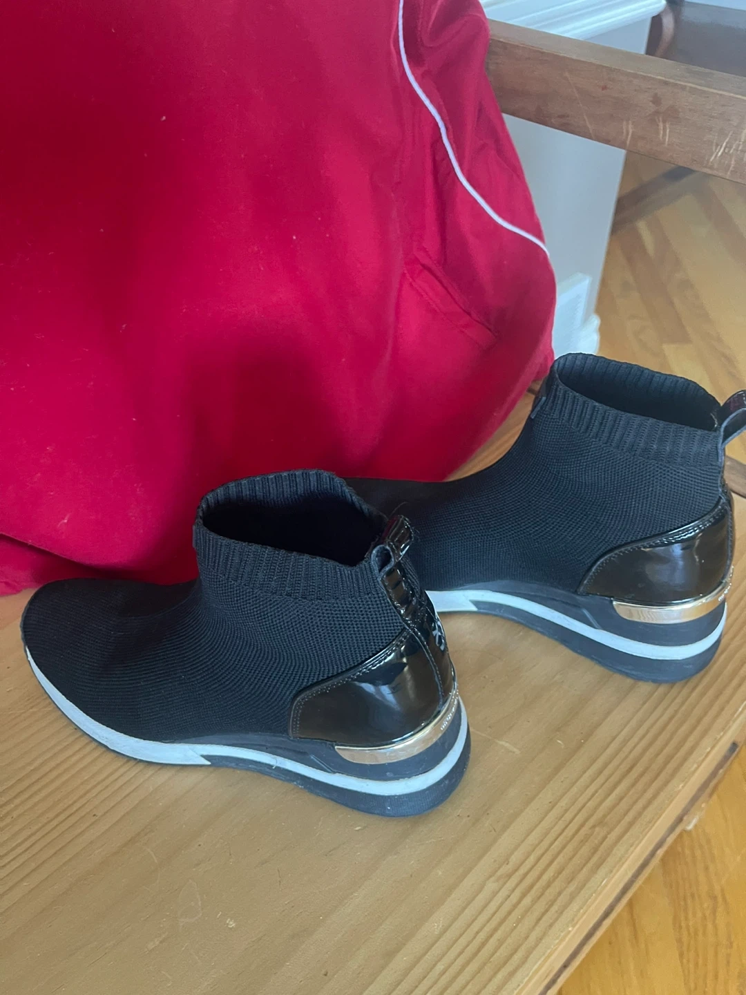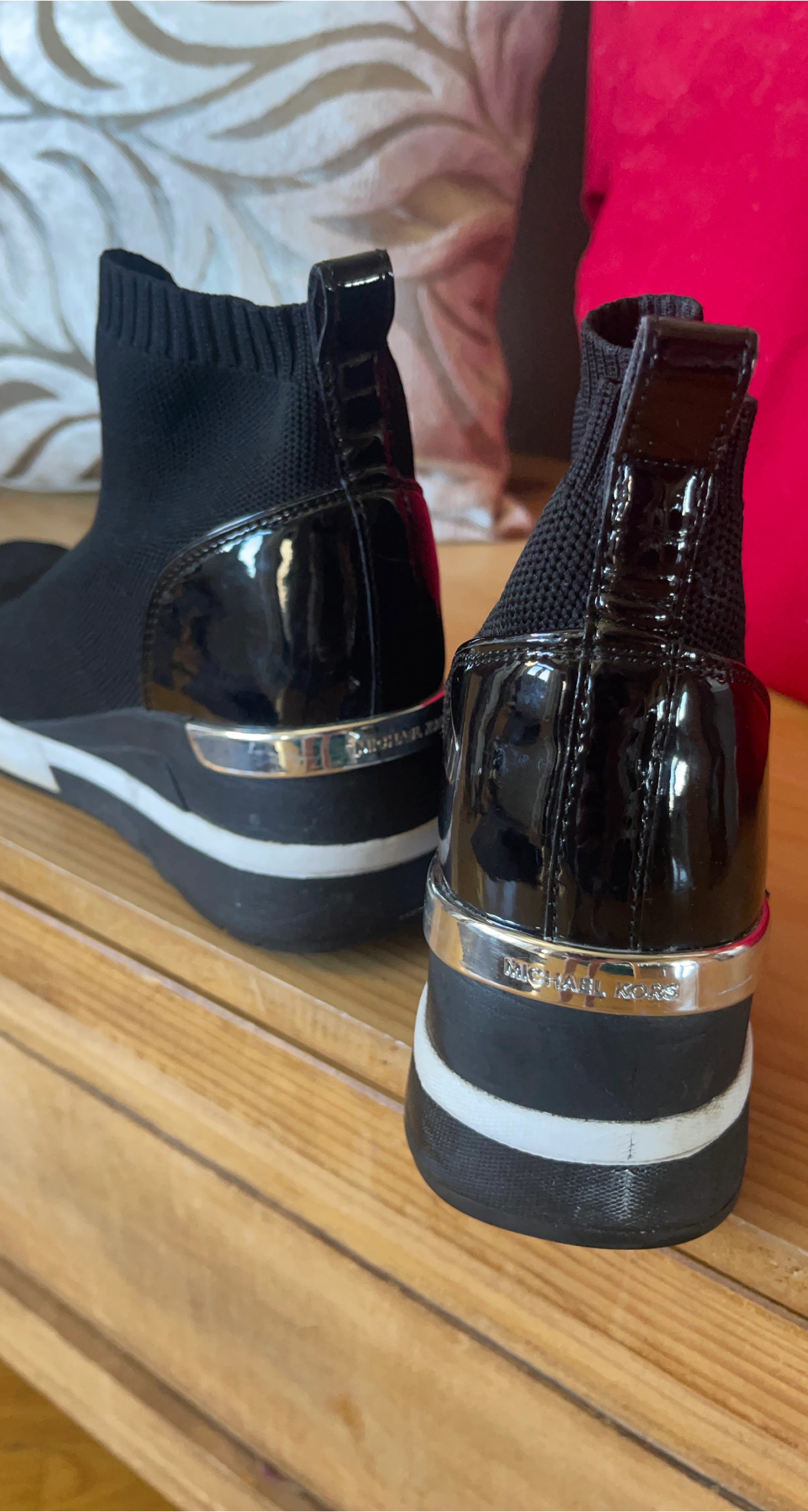 754Stylish Michael Kors sock sneakers in black, size 8. These have a sleek, modern look with a comfortable sock-like fit. The shiny black heel detail and platform sole add a touch of elegance to these casual shoes. Perfect for everyday wear!