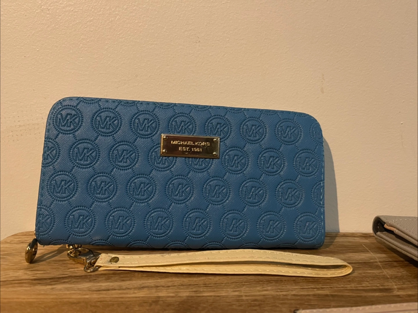 28Selling a cute Michael Kors wallet in blue! It's in great condition and has lots of space for cards and cash. The wallet features the MK logo pattern all over and a convenient wrist strap
