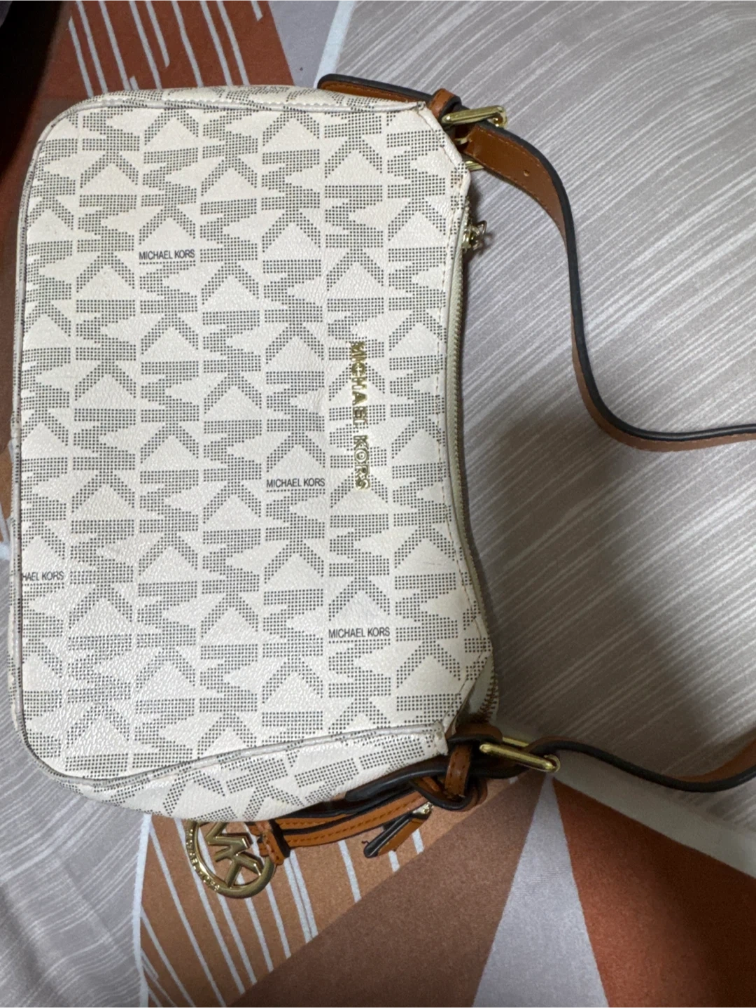 60Selling a Michael Kors shoulder bag in a cream and brown colour scheme. It's in great shape and ready for a new home! The bag features the MK logo pattern and a zippered closure.