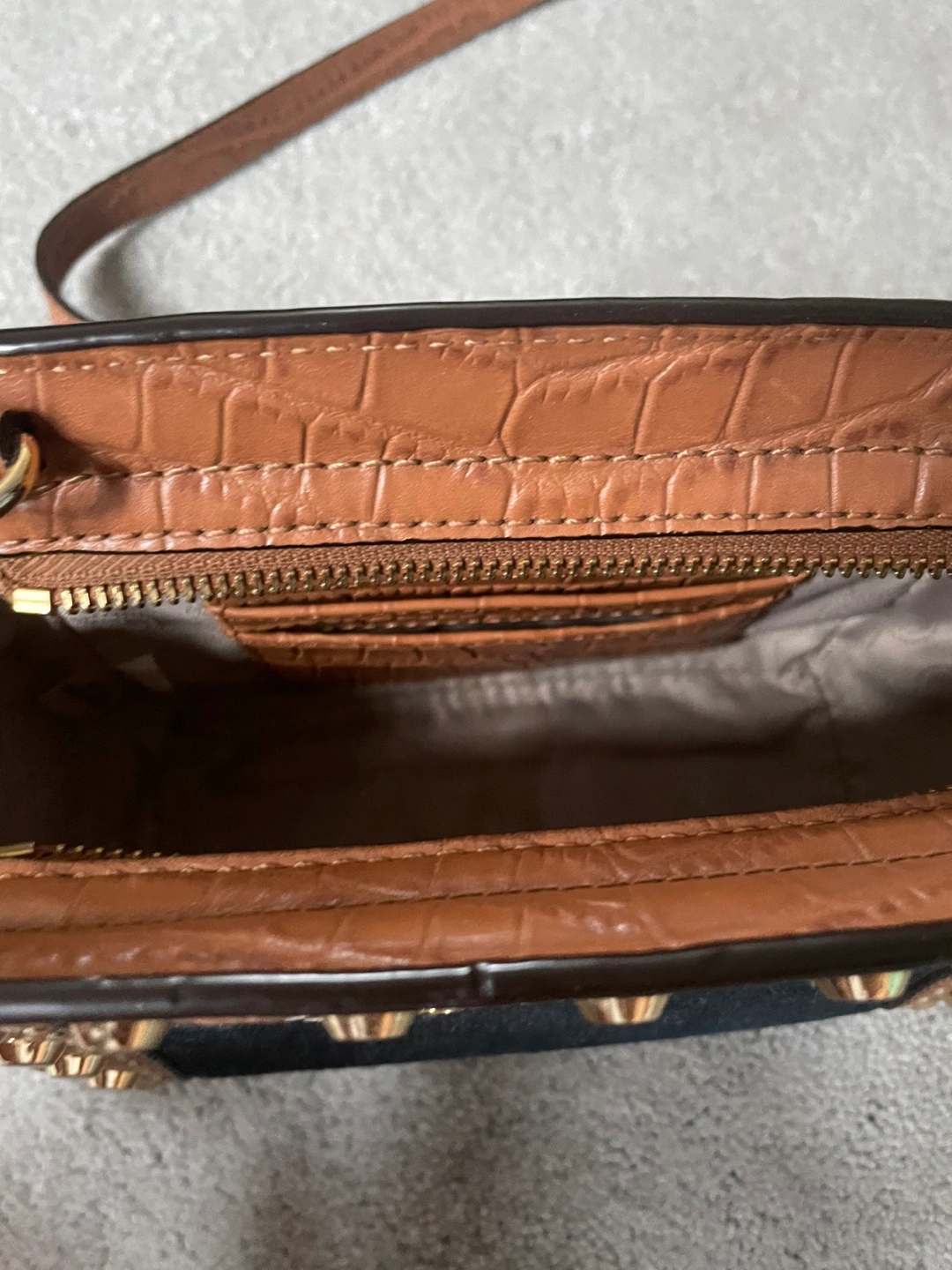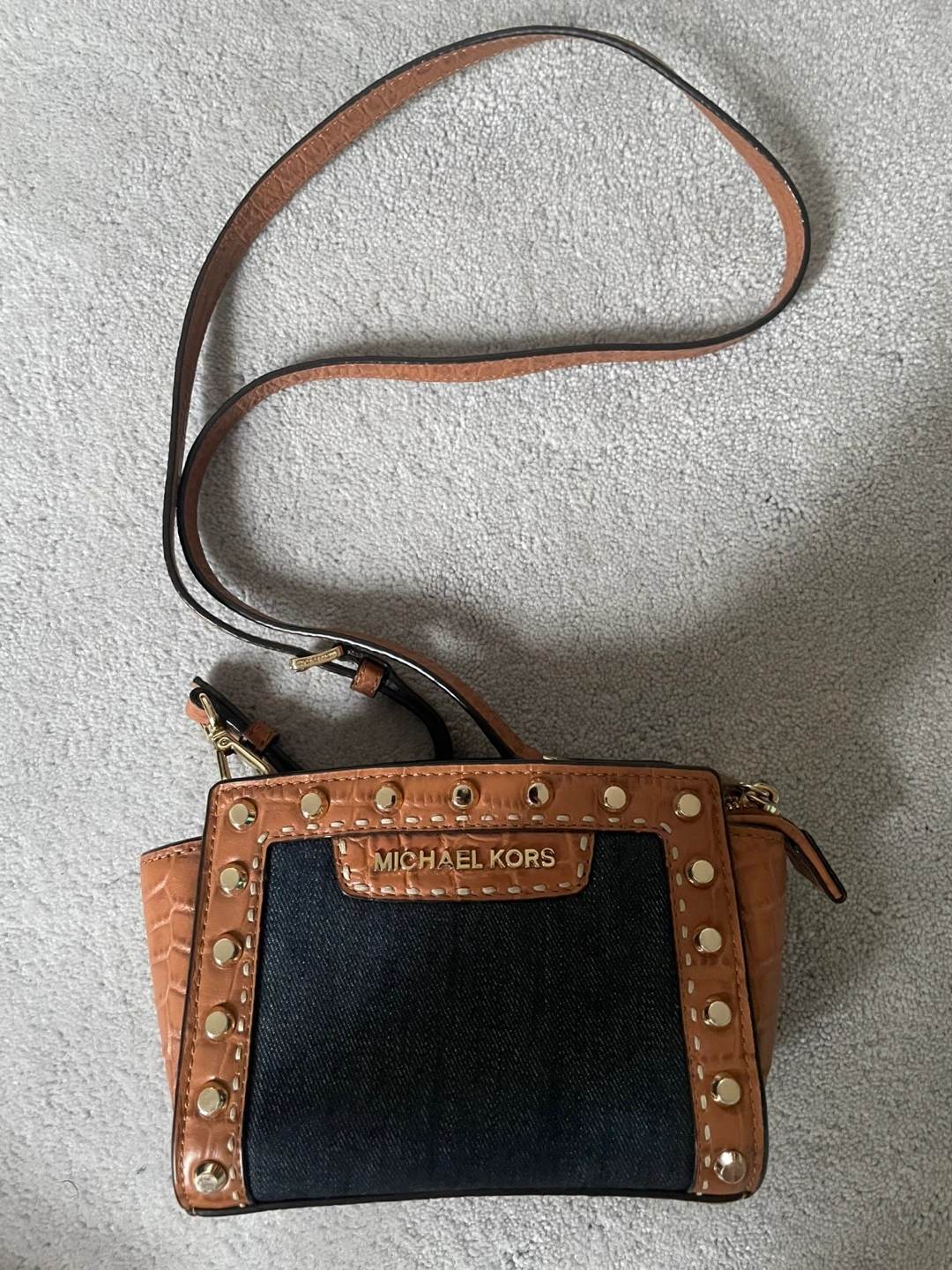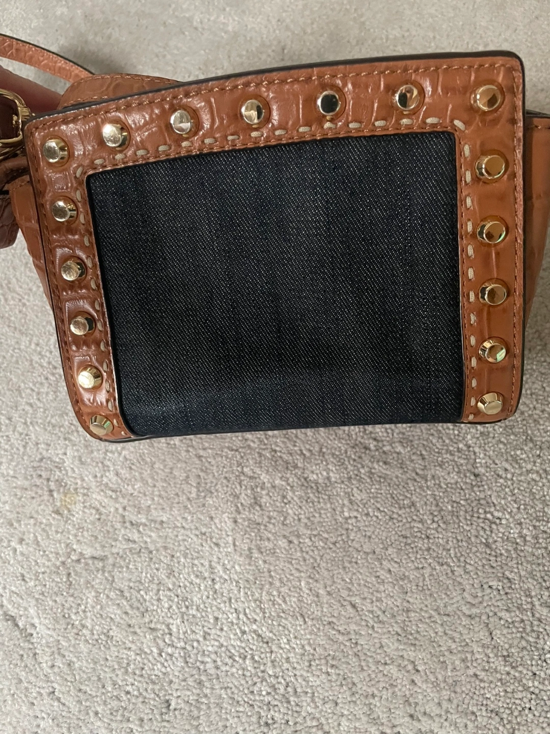 10Selling a stylish Michael Kors crossbody bag! The bag features a unique design with a combination of denim and croc leather trim, accented with gold studs. Limited Edition