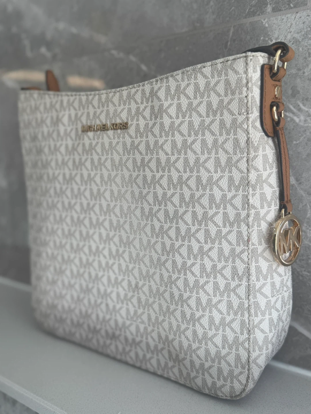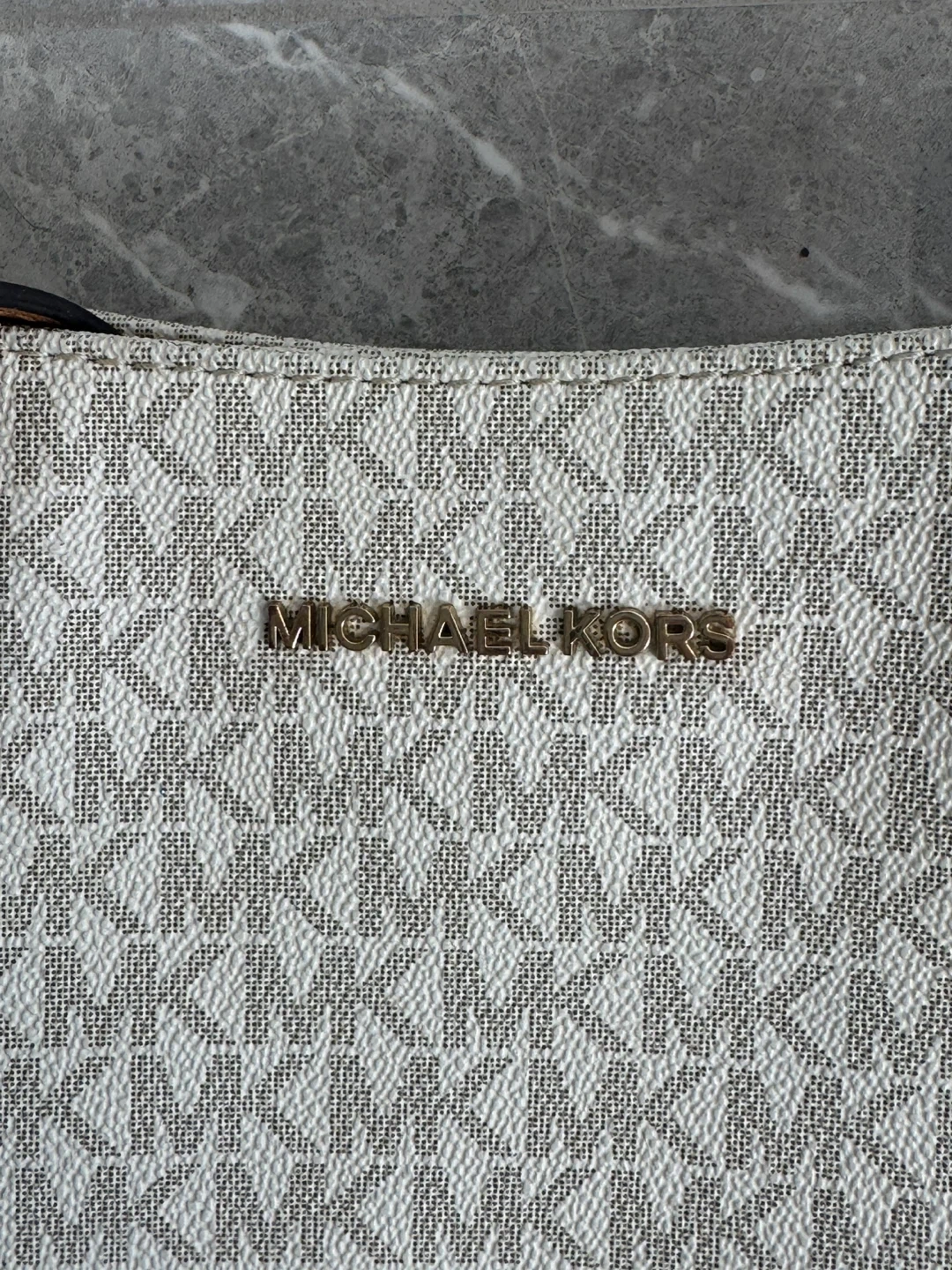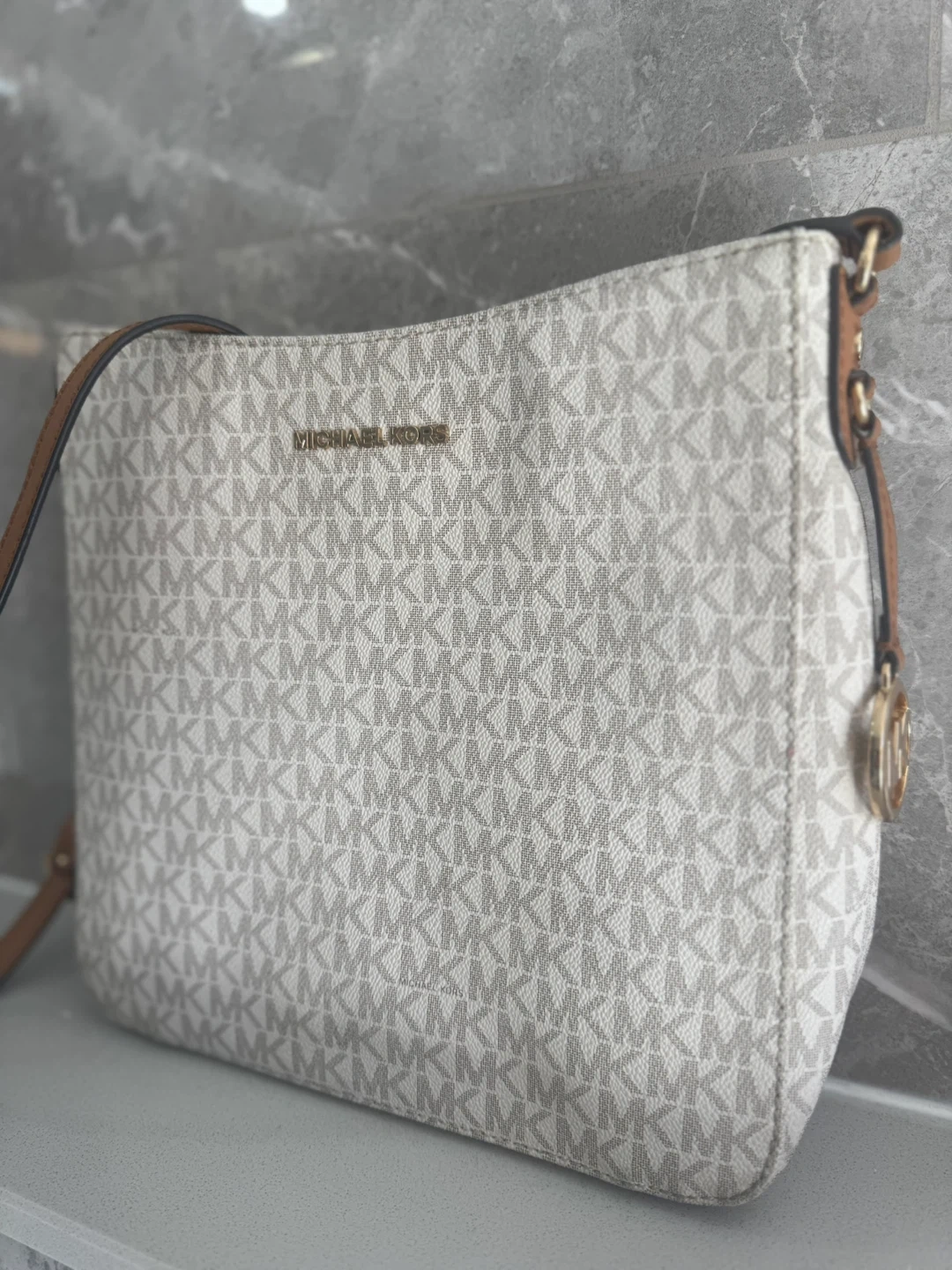 22Selling a Michael Kors crossbody bag in excellent condition! It features the classic MK monogram pattern in white and grey, with brown accents. The bag has a gold-tone MK logo charm. Perfect for everyday use!