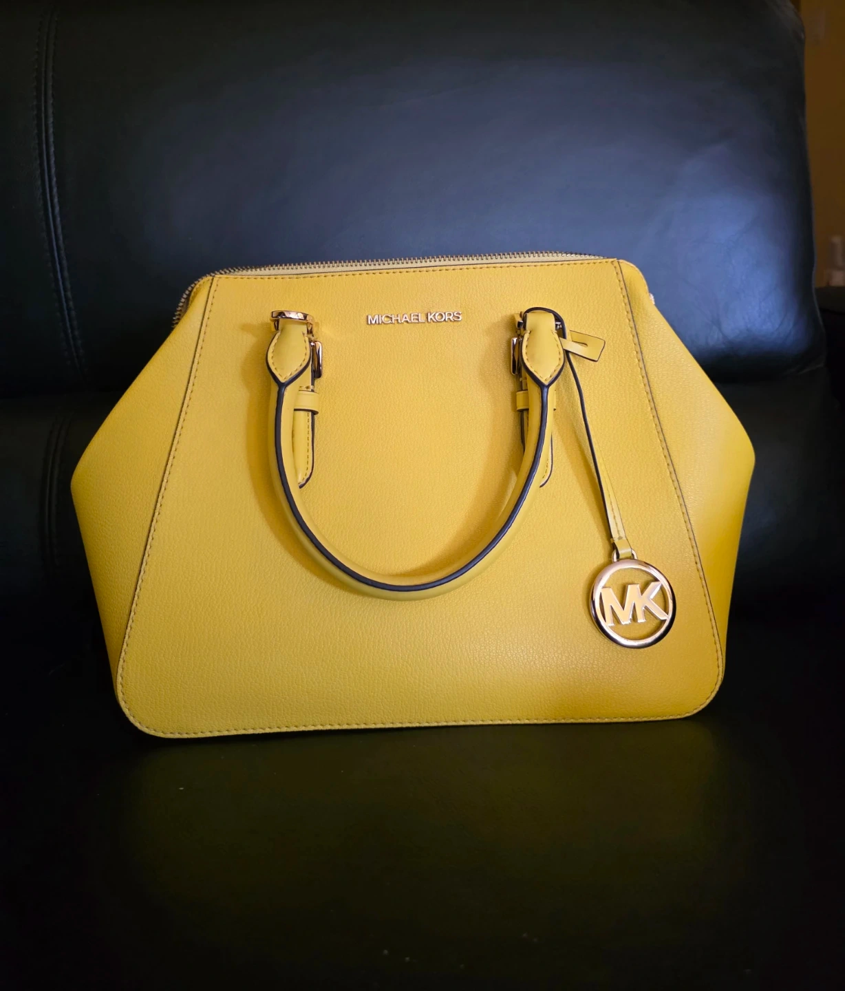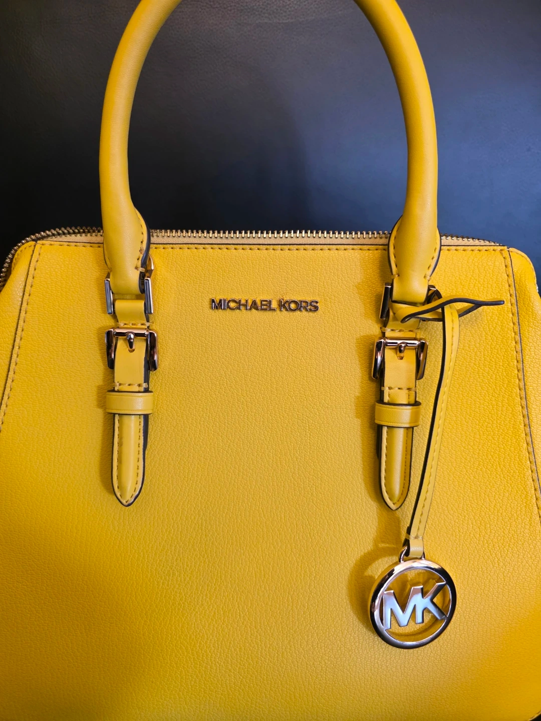 10This stunning yellow Michael Kors crossbody satchel is crafted of saffiano leather, featuring a top zipper closure, a spacious interior with a zipped pocket and two open pockets to organize essentials. Comes with detachable adjustable crossbody strap. Used a few times - in almost brand new condition.