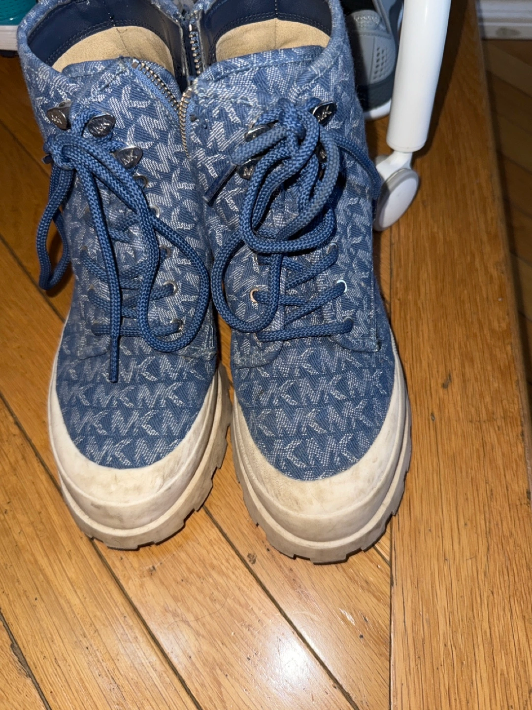 10Selling a pair of Michael Kors platform boots with a unique denim print! They have a lace-up design and a chunky sole. These boots are perfect for adding a bit of edge to your outfit. They show some signs of wear on the soles.