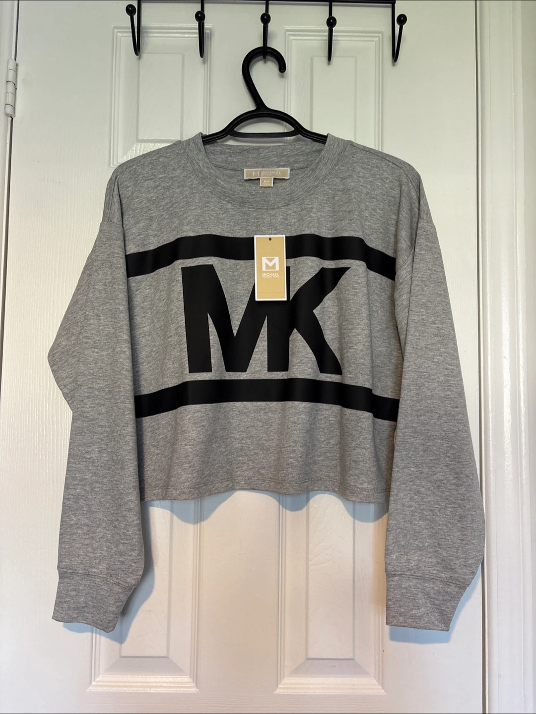 Here's a stylish Michael Kors cropped sweatshirt in a versatile grey with black accents! It's a size small and in great condition. This sweatshirt is perfect for a casual, trendy look. Feel free to ask any questions!