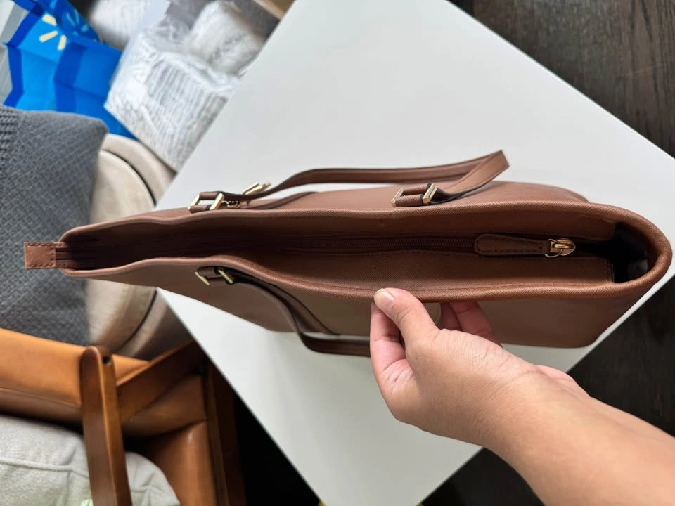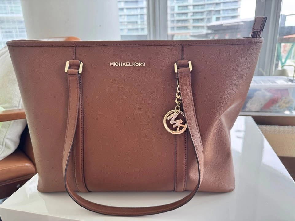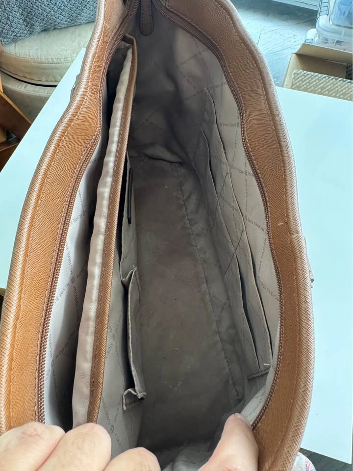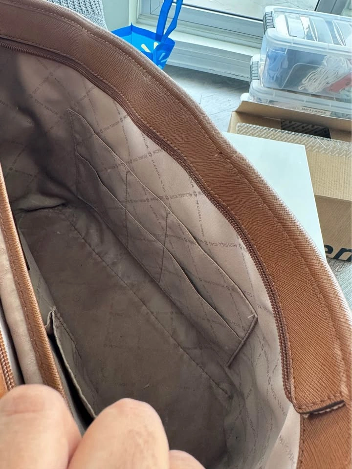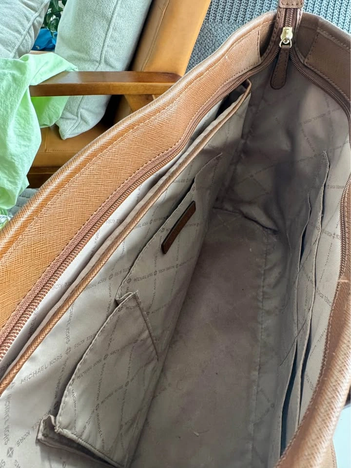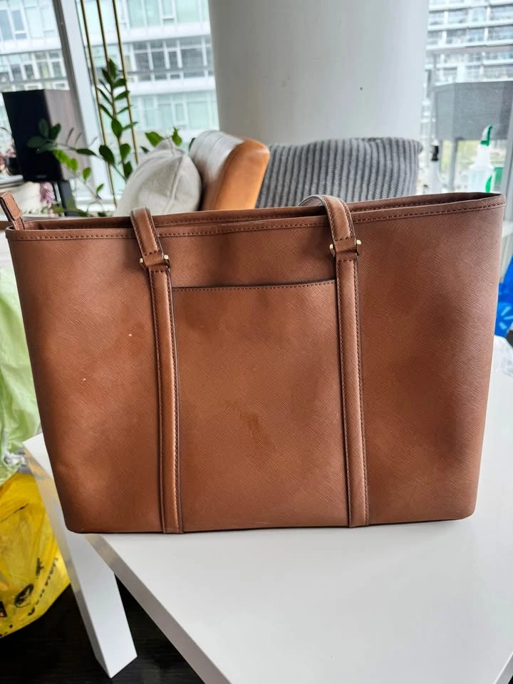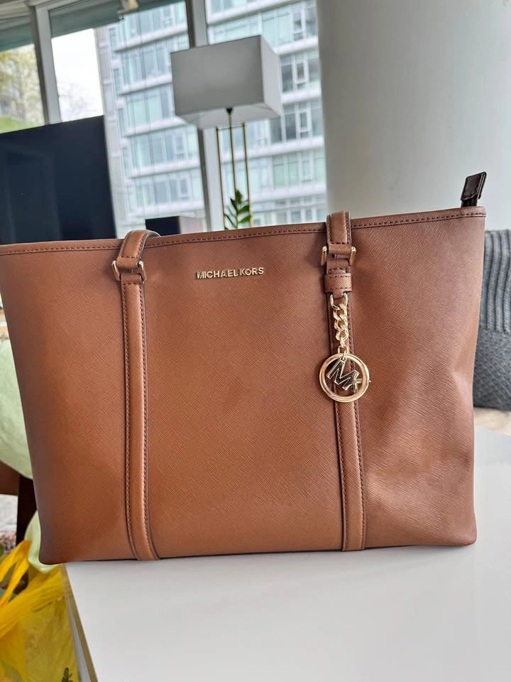 Brown leather large Michael kors tote bag/leather bag One side will occasionally buckle in when empty however does not do this when it has stuff in it Pickup Olympic village