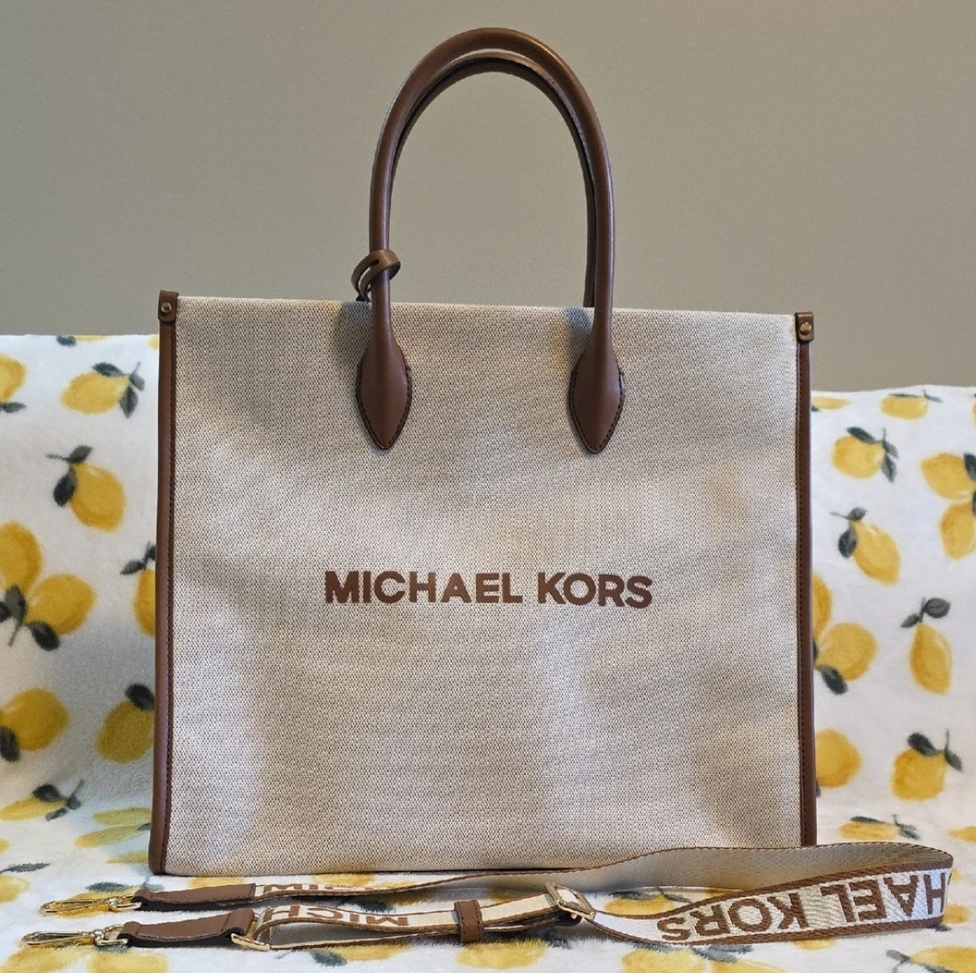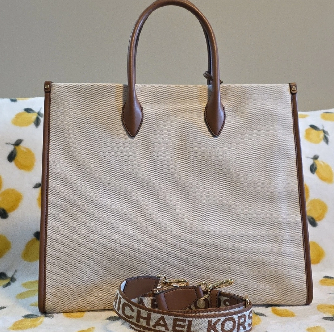 ⭕️ Authentic, large capacity ⭕️ Feels like a "neverfull" bag ⭕️ Great hand carry bag during holidays ⭕️ Neutral colour, leather bottom / base ⭕️ Convertible to crossbody, with MK strap Length: 13.5 inches Width: 7 inches Height: 15 inches ⭕️ Only used once during travel, was airline approved, did not get any issue with it as my hand carry luggage ⭕️ There is a small peel on the right side of the front handle but barely noticeable (see photo for close up inspection) ⭕️ No dust bag, bought via online store at $199 📍 Meet up in Kingsway Mall or at Purolator store in 11220 104 Ave. NW Edmonton. Thanks for dropping by! 👍