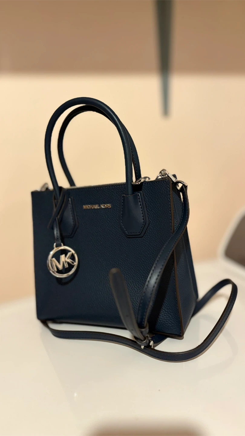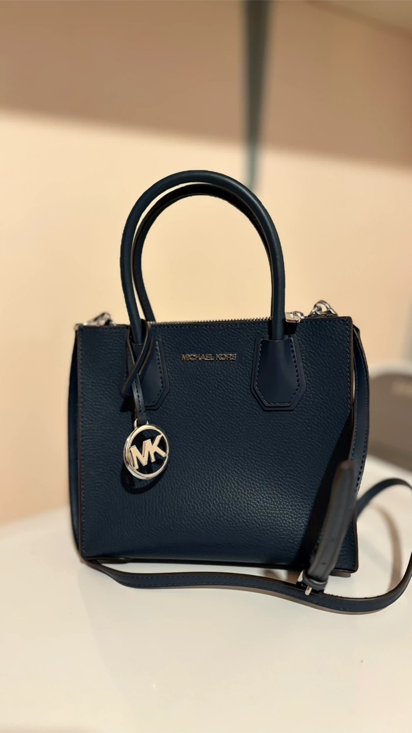 10This is a beautiful Michael Kors small satchel in navy blue. It's in great condition and perfect for everyday use or a night out. The size is ideal for carrying your essentials without being too bulky. It has a stylish MK charm and a comfortable strap
