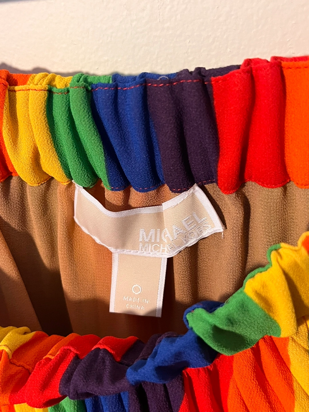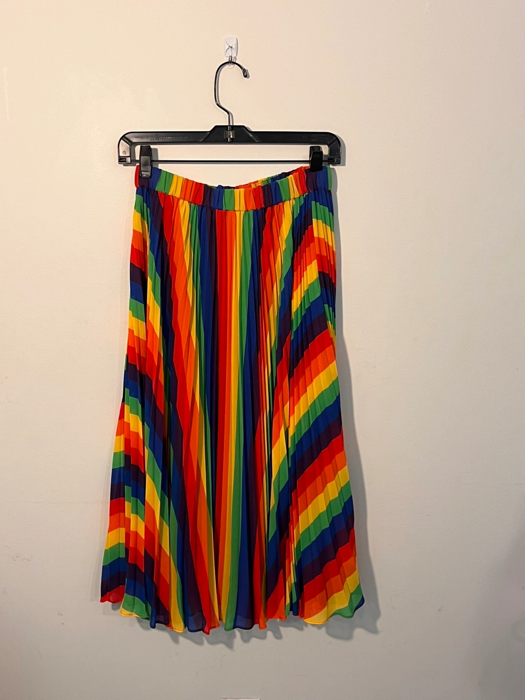 Here's a fun and colourful Limited Edition Michael Kors skirt! It features a vibrant rainbow pattern with pleated detailing. Perfect for adding a pop of colour to your wardrobe!