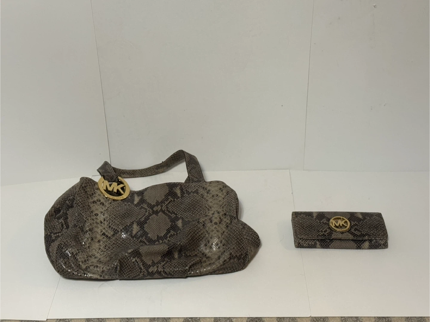 Buy & SellMichael Kors Snakeskin Print Handbag & WalletMichael Kors Snakeskin Print Handbag & Wallet$65Selling a Michael Kors handbag with a snakeskin print, along with a matching wallet! Both are in great condition and feature the classic MK logo.ConditionLike newBrandMichael Kors0 chats·1 favorites·16 viewsSELLERverifiedTony DinardoMaple650 reviewsWHERE TO MEETCheck Location