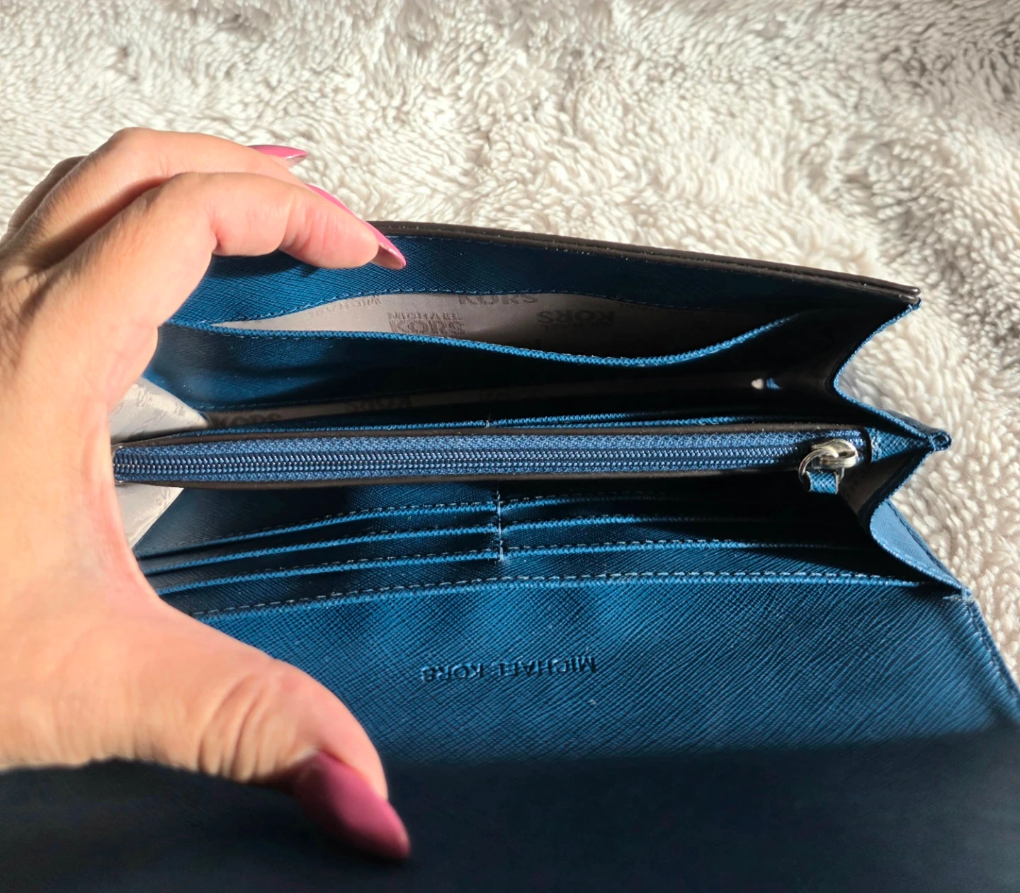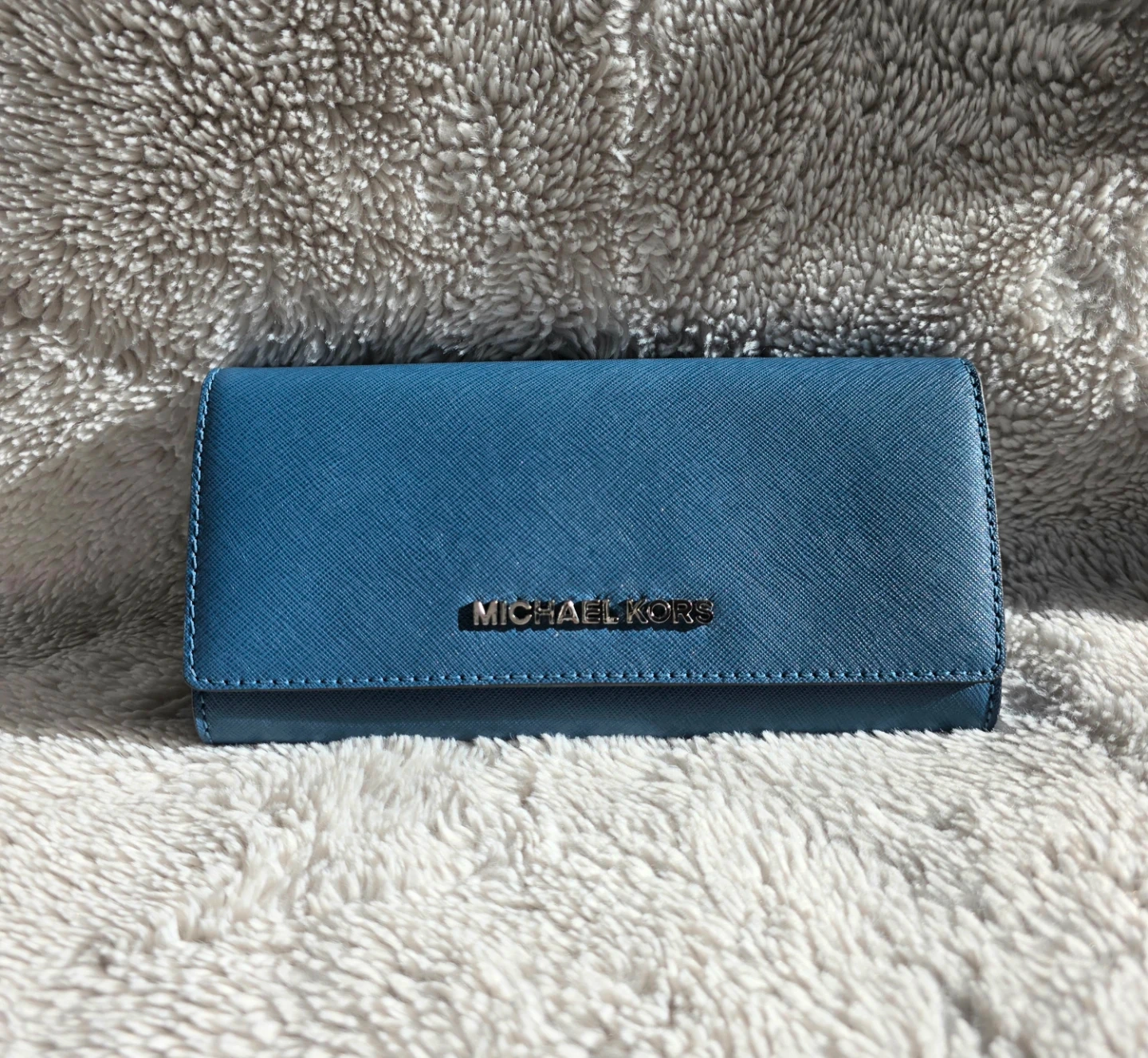 10Chic Michael Kors Jet Set Travel Carryall Wallet in "powder blue" shade Crafted of saffiano leather, it features a flap closure on the front with ample interior pockets, credit card slots, a middle zipped pocket, and a back pocket. 8" x 4.75" x 1" Almost brand new condition.