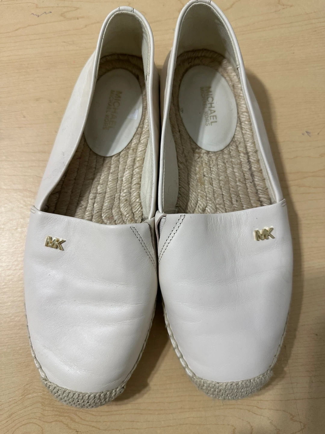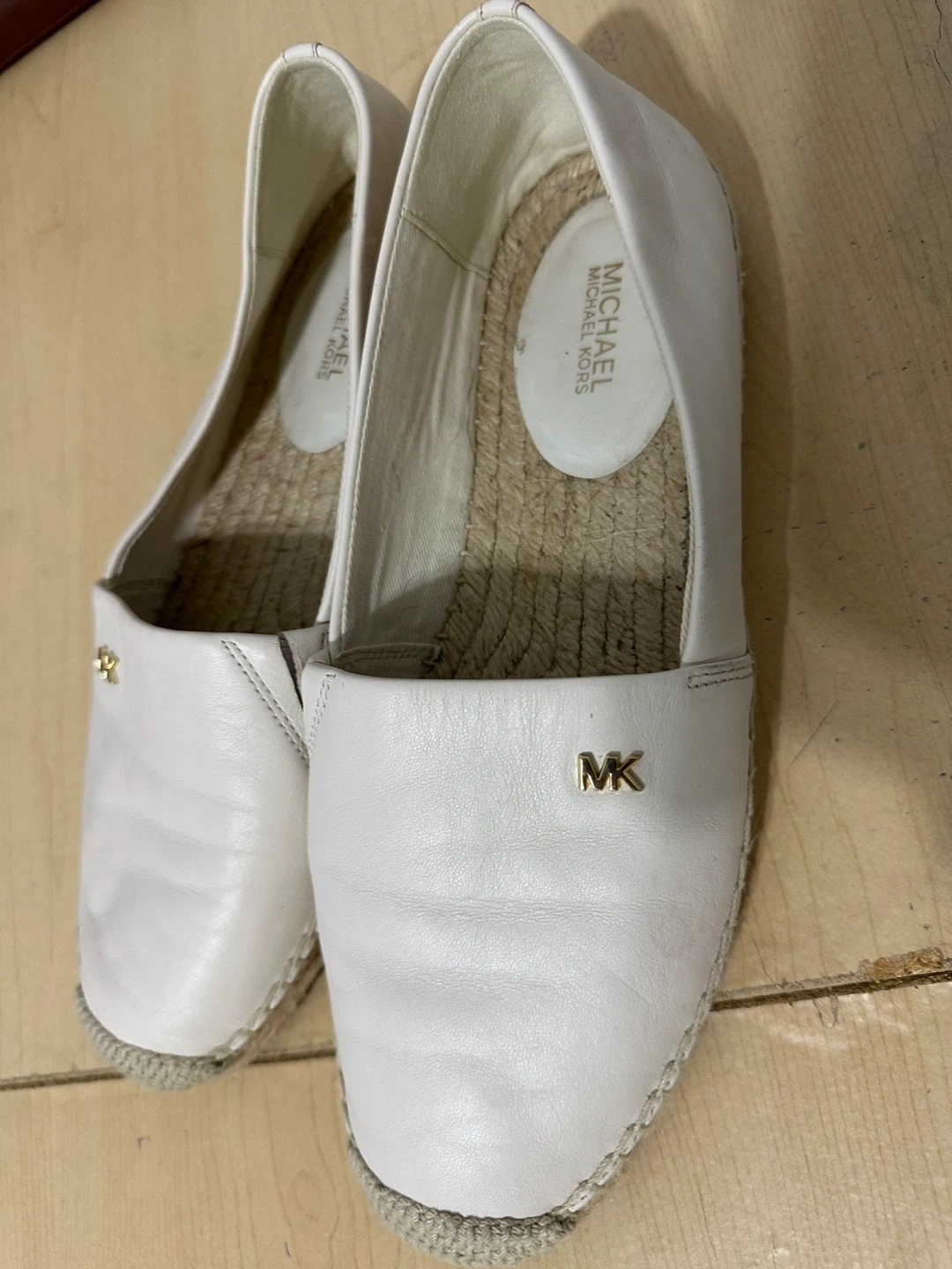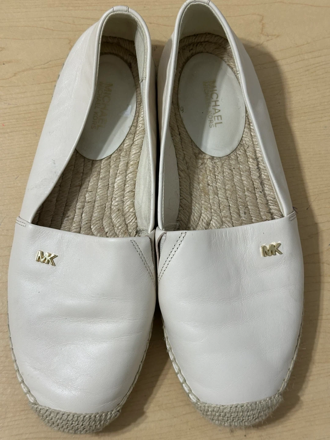 These are a pair of Michael Kors espadrille slip-on shoes in white leather. They feature the MK logo on the side and a jute rope sole. They're perfect for a casual summer look