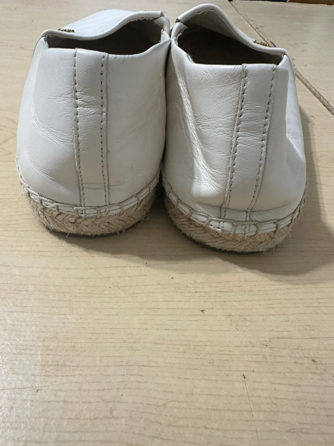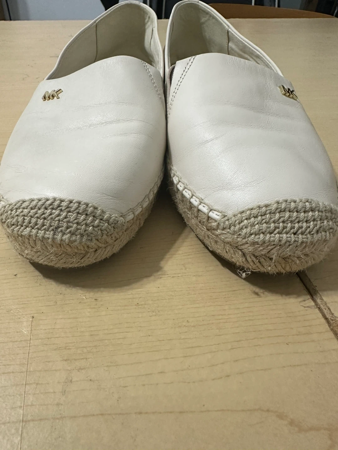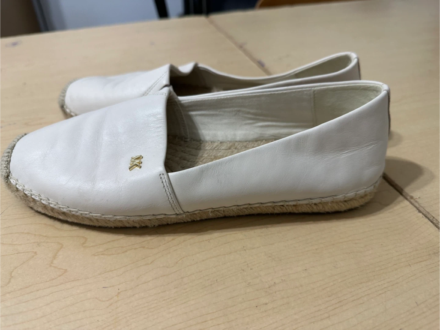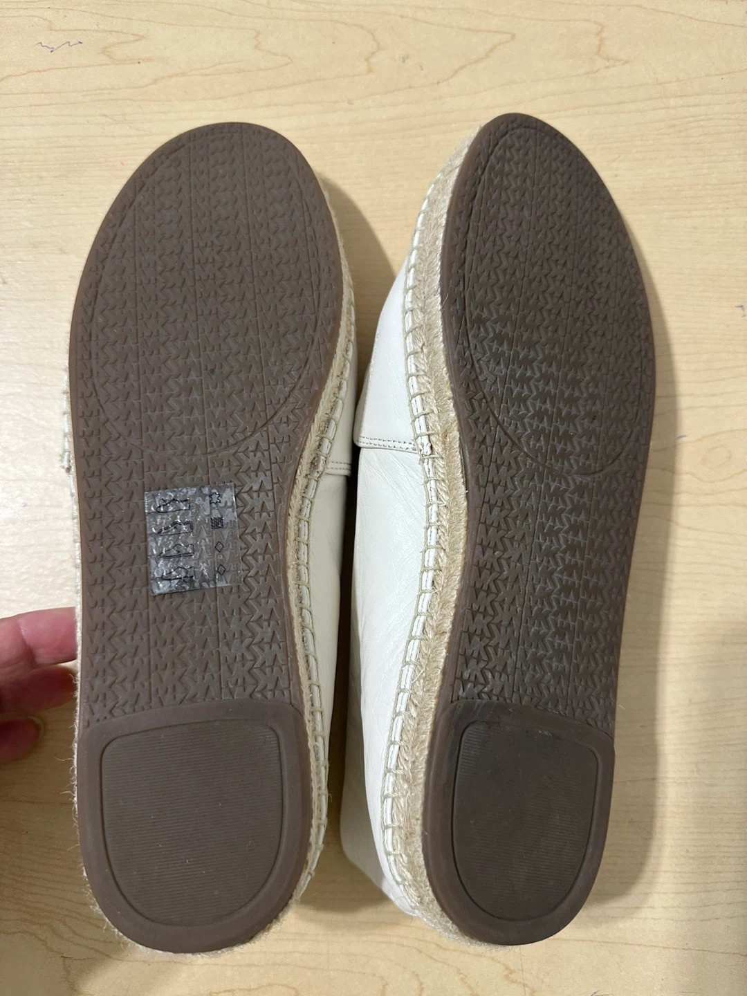 These are a pair of Michael Kors espadrille slip-on shoes in white leather. They feature the MK logo on the side and a jute rope sole. They're perfect for a casual summer look