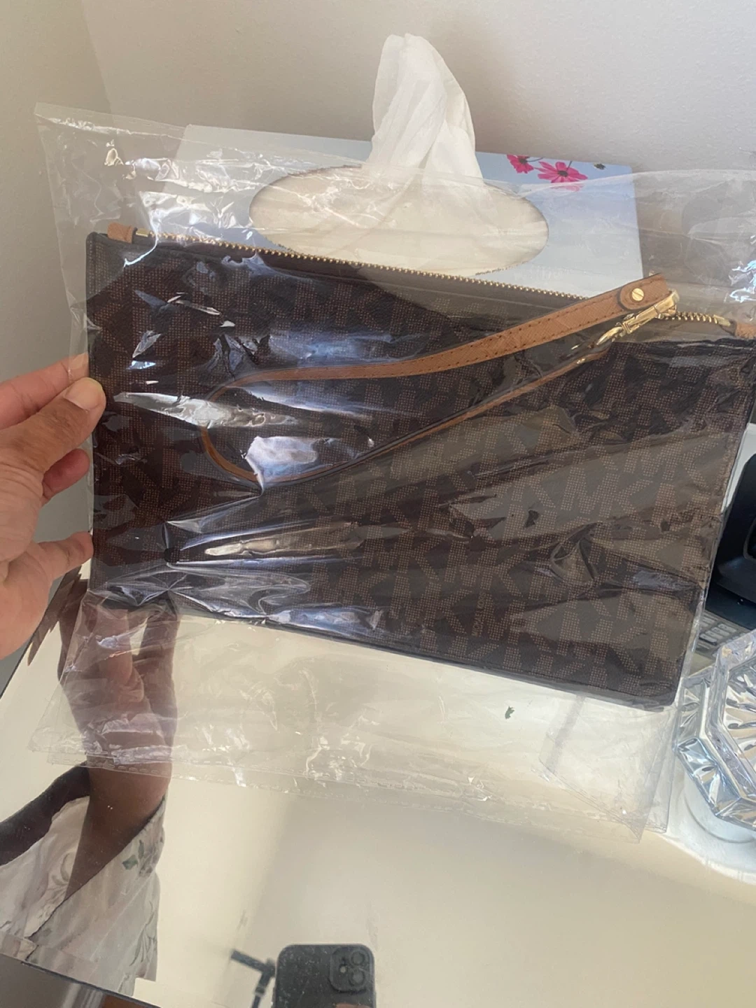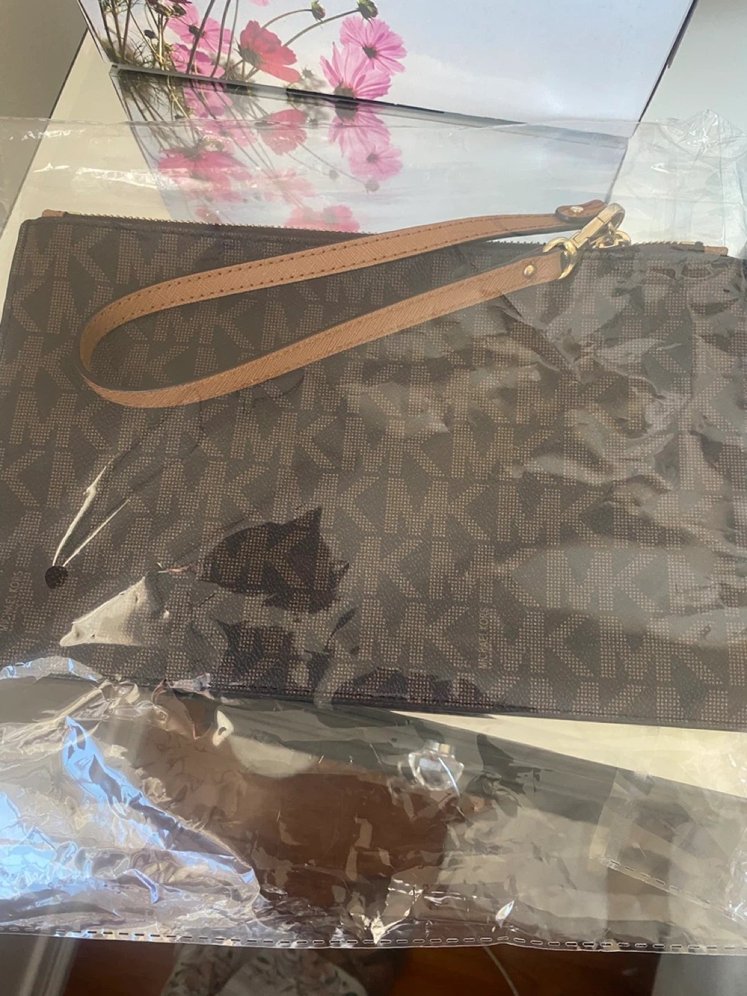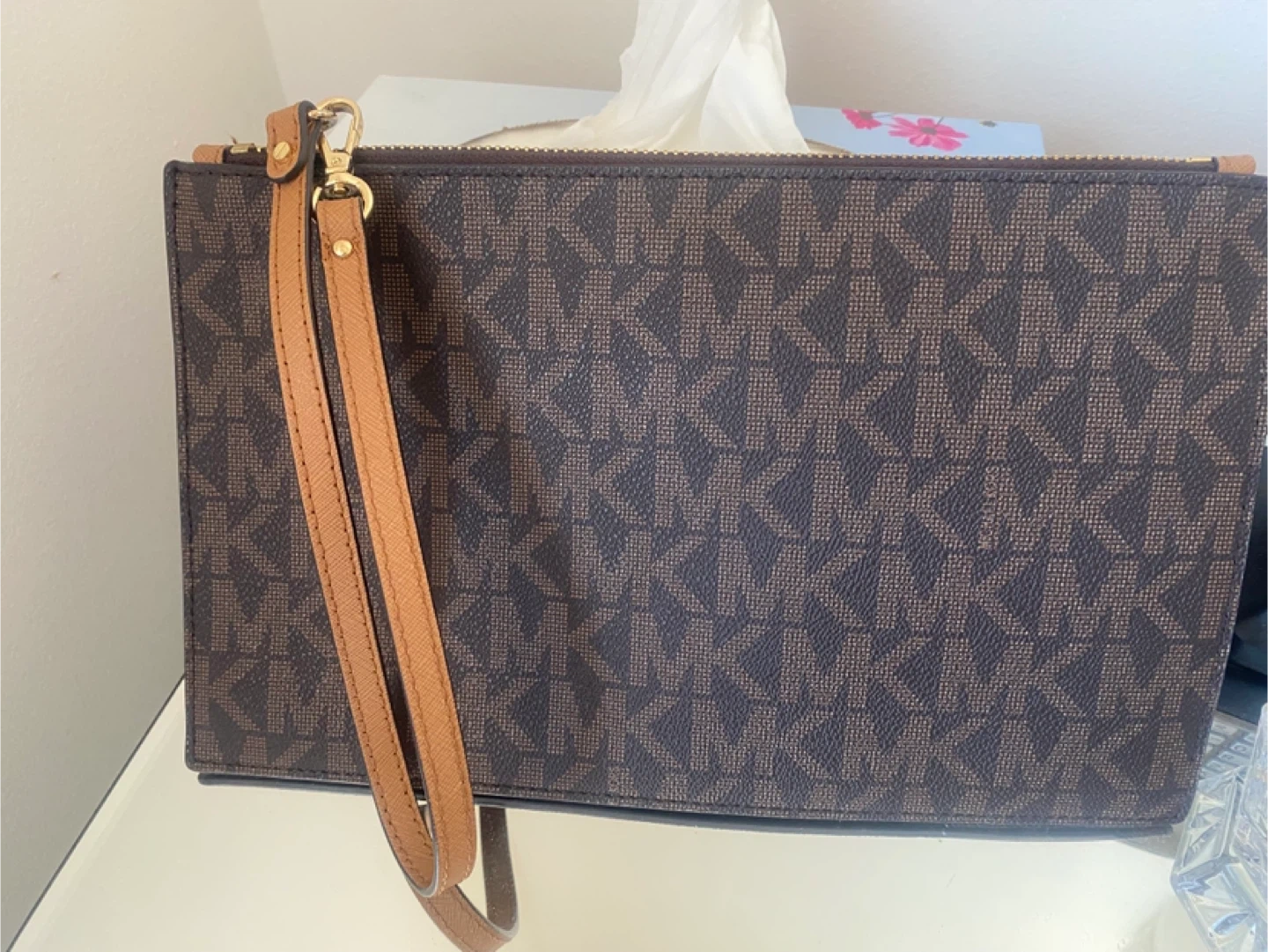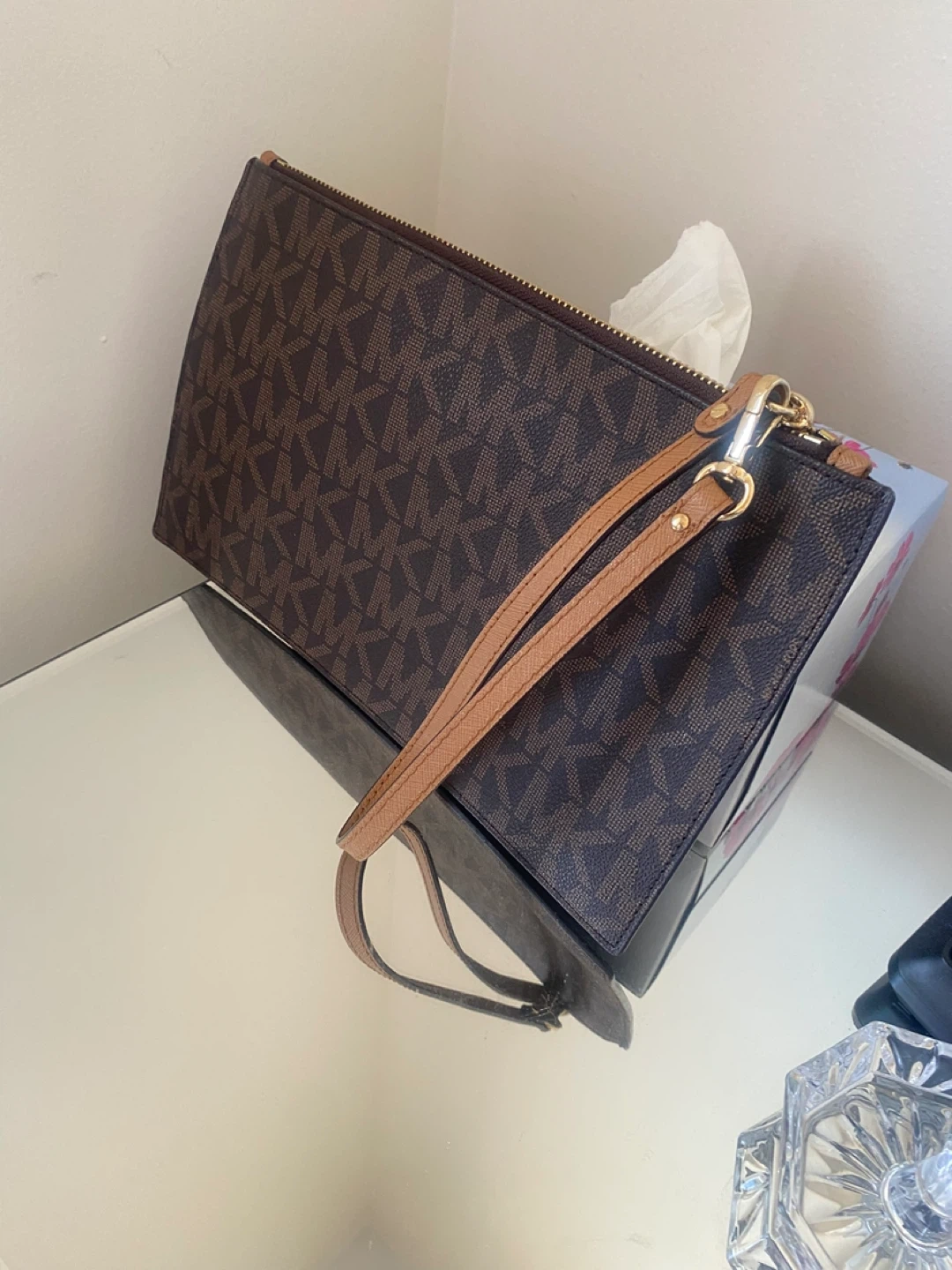 10Selling a Michael Kors wristlet in excellent condition! It features the classic MK logo pattern and a convenient wrist strap. Perfect for keeping your essentials organized on the go