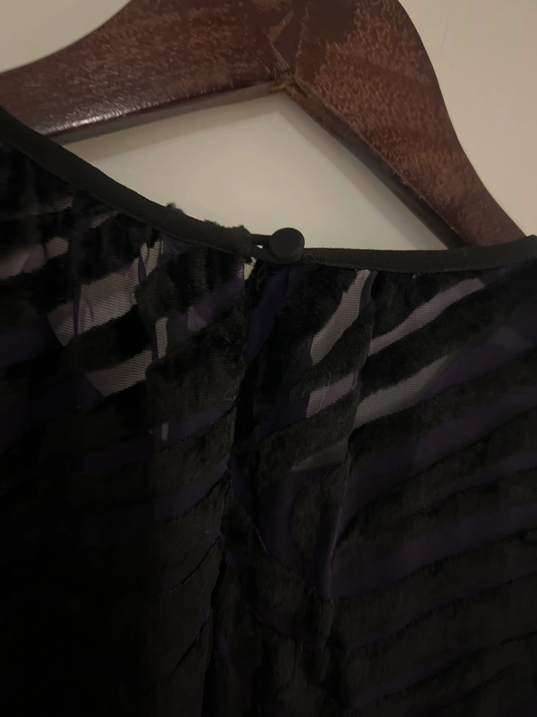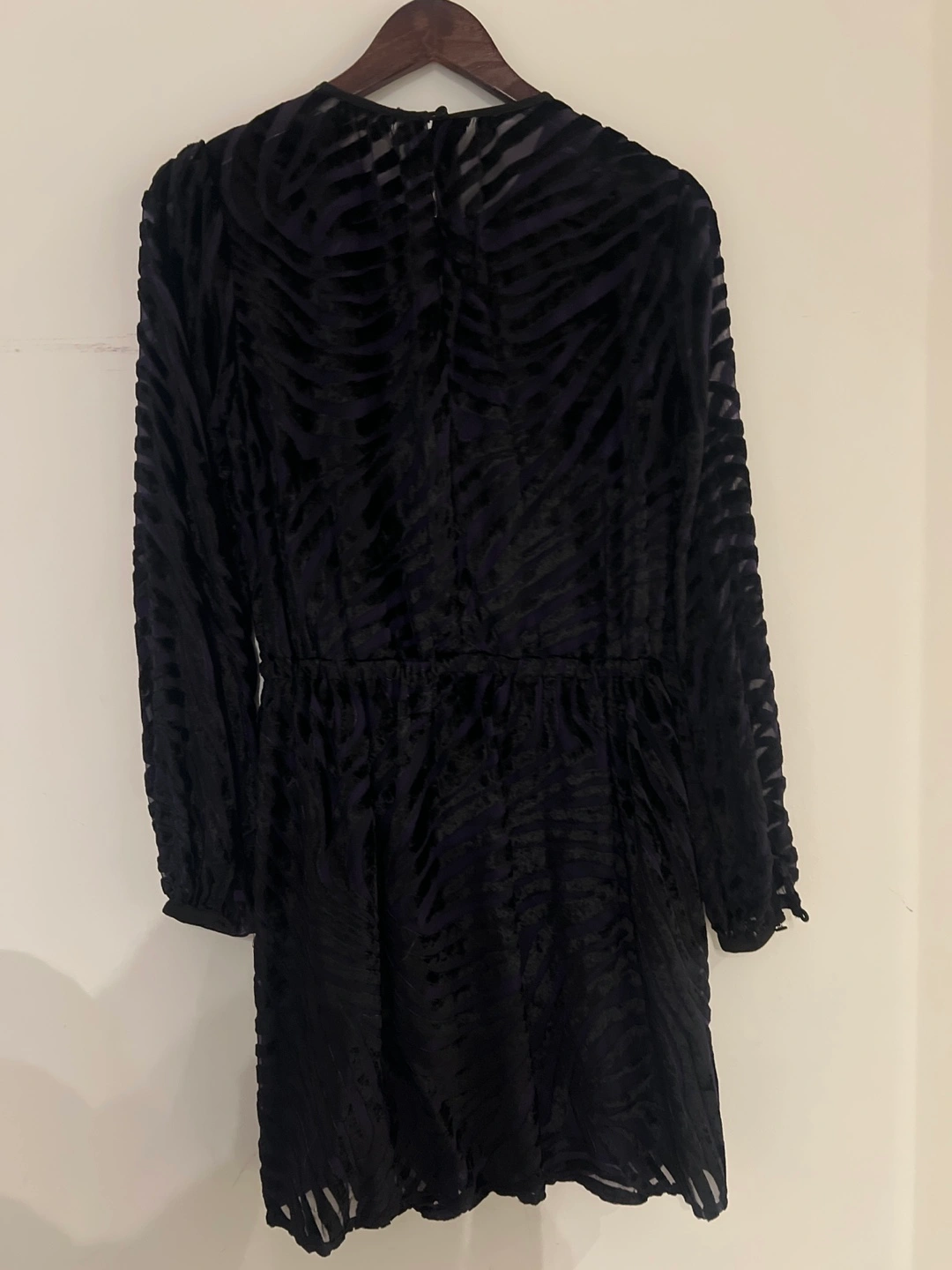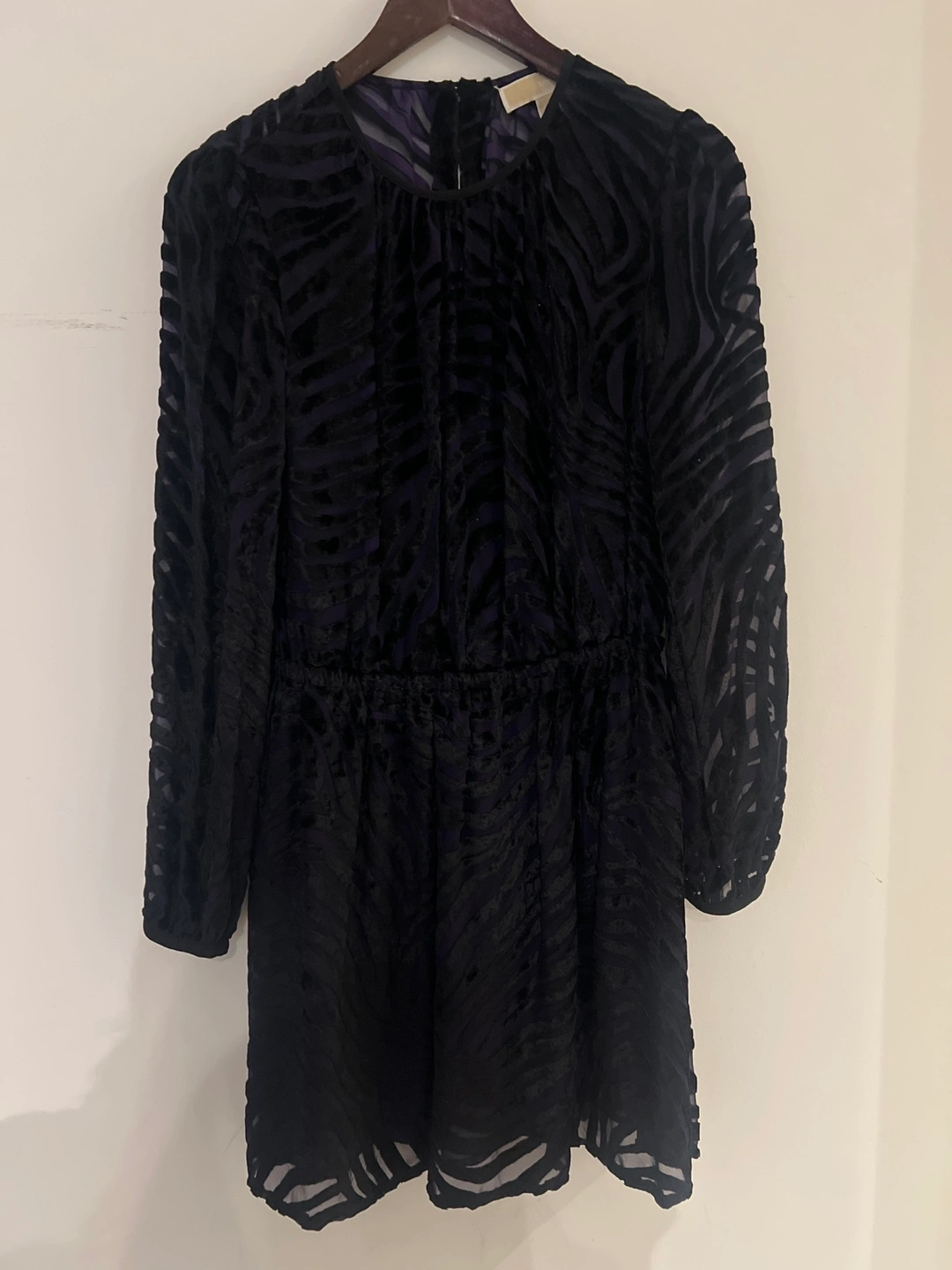 Stunning mini dress. Features a zebra print velvet overlay on sheer fabric. Long sleeves. Elastic waistband. Size Small/Medium