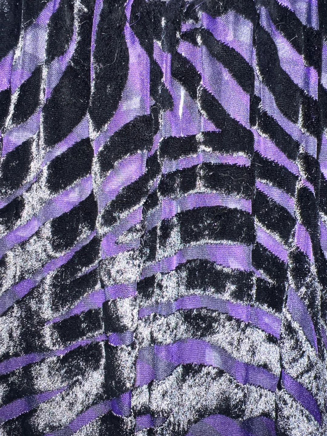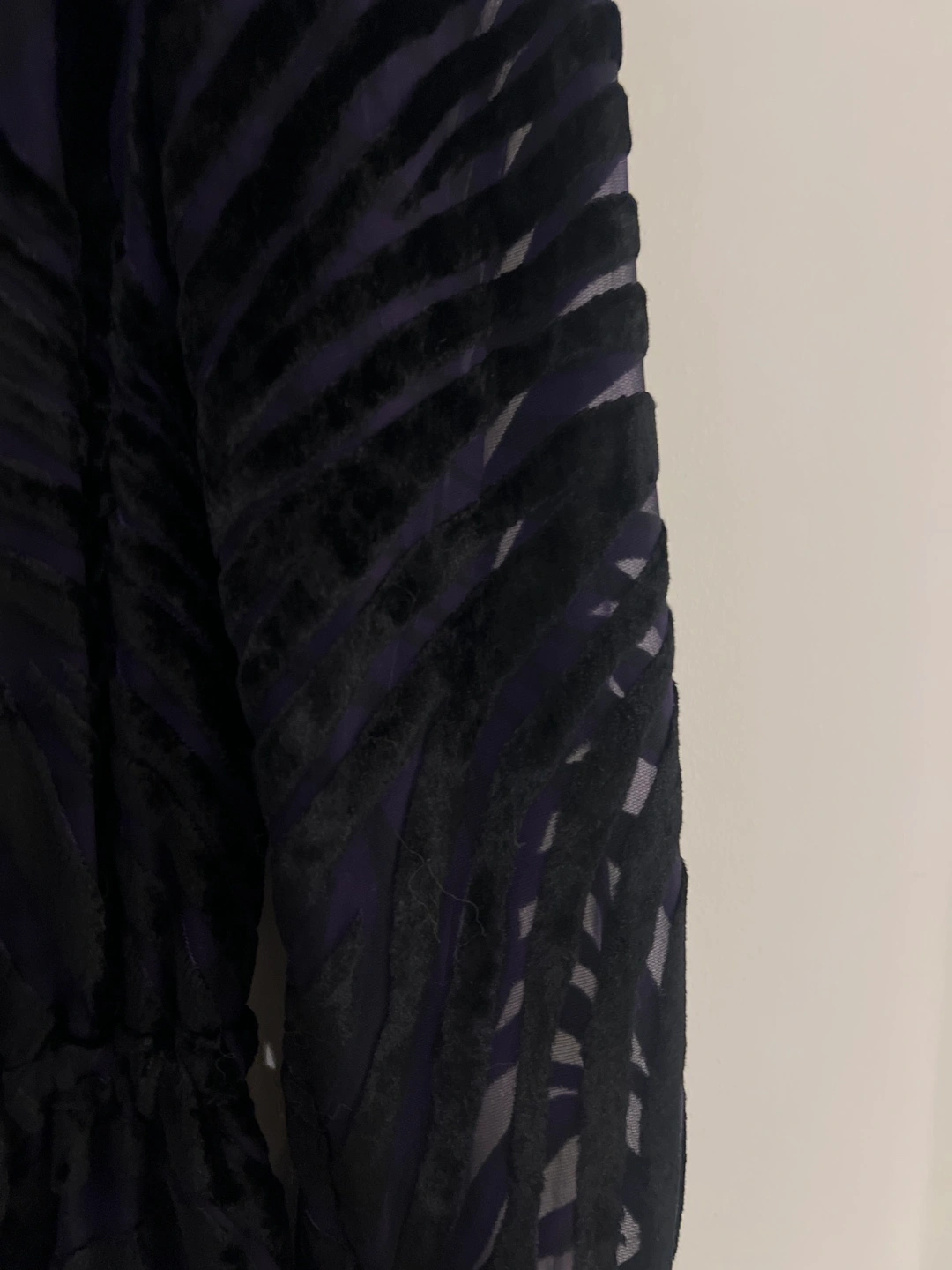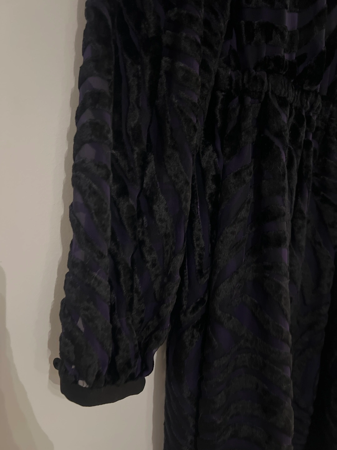 Stunning mini dress. Features a zebra print velvet overlay on sheer fabric. Long sleeves. Elastic waistband. Size Small/Medium