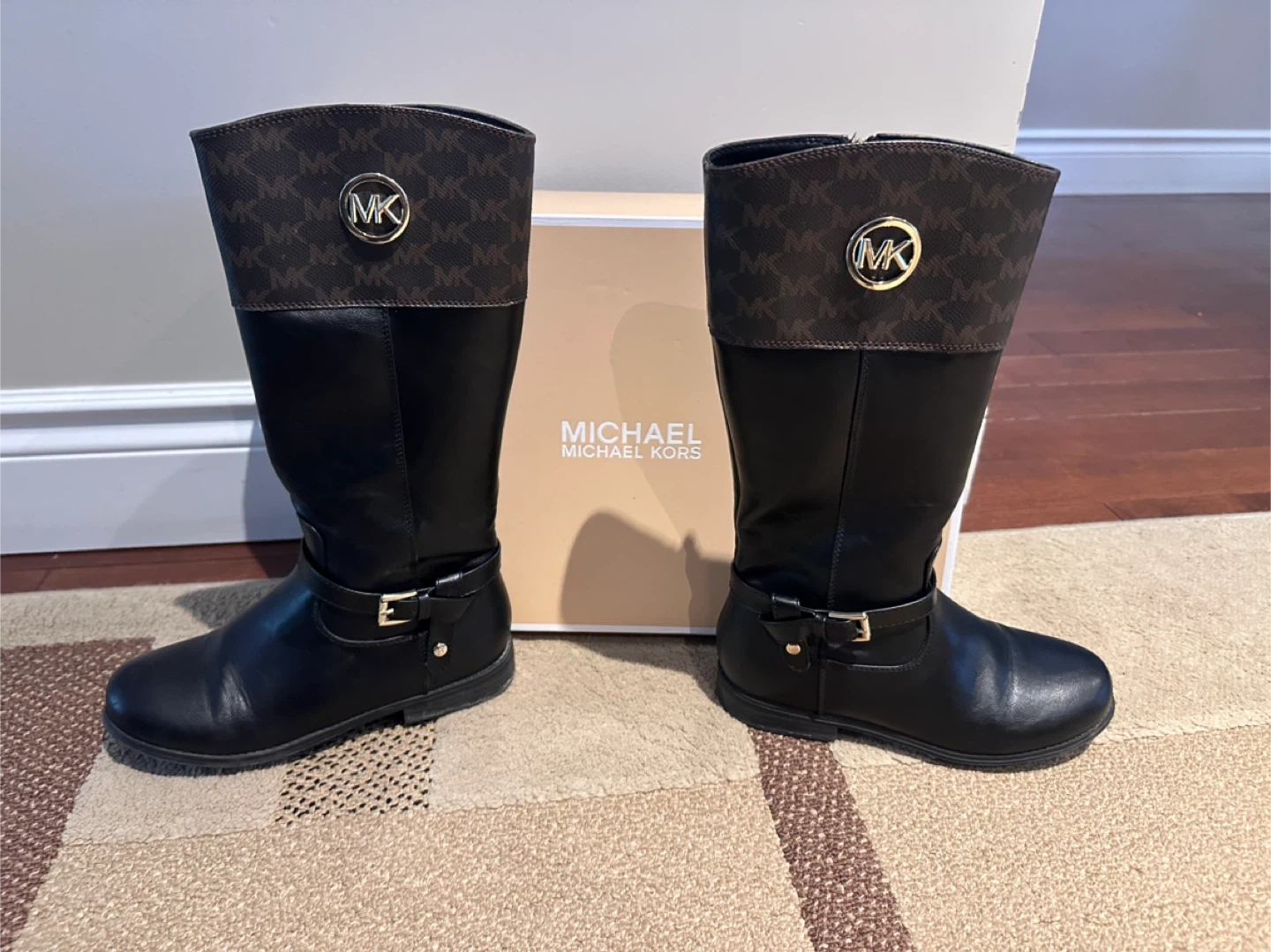 These Michael Michael Kors riding boots are in great condition and come with the original box! They are black with the MK logo pattern at the top. Perfect for fall and winter! Girls Size 3