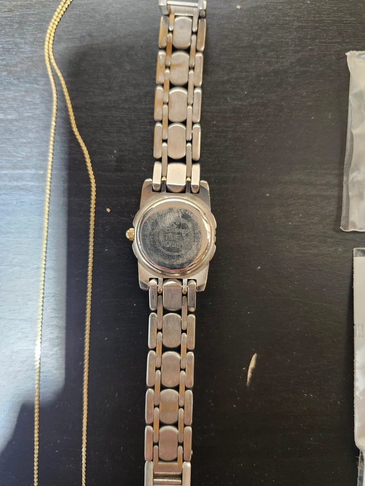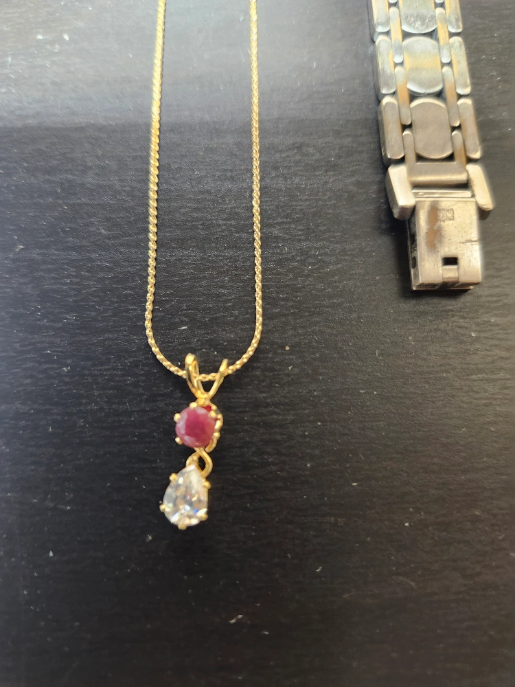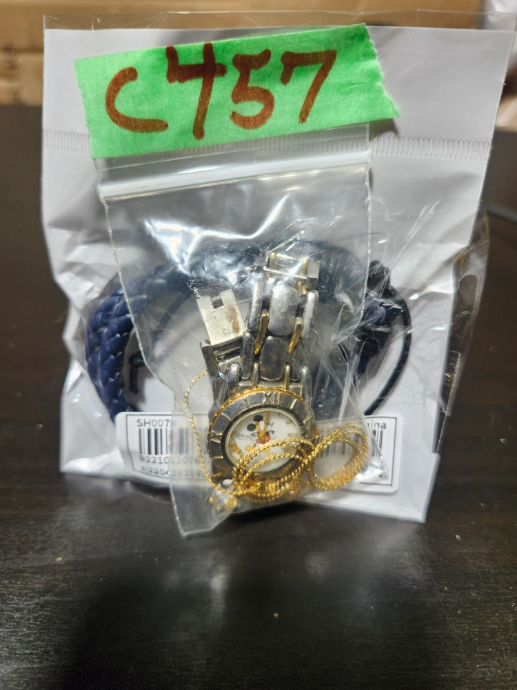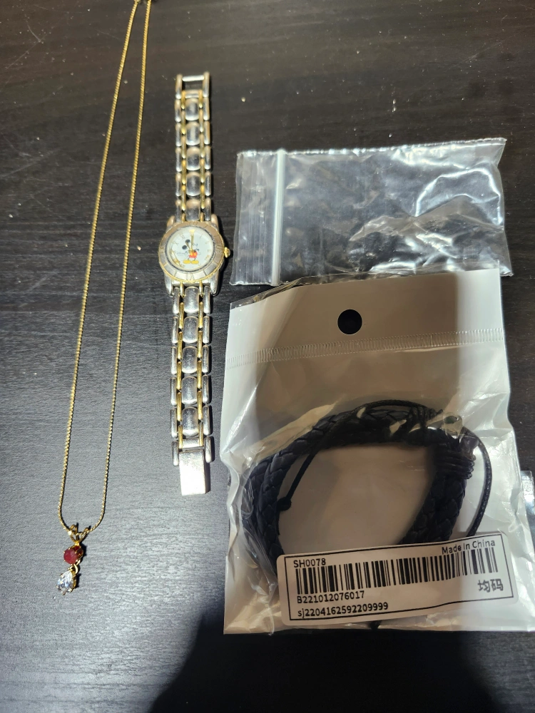 Selling a cute set that includes a Mickey Mouse watch, a necklace with red and clear stones, and a braided bracelet. The watch has a silver-tone band. All items are in good condition and ready for a new home! mickey mouse watch needs battery used..necklace new..braclet new