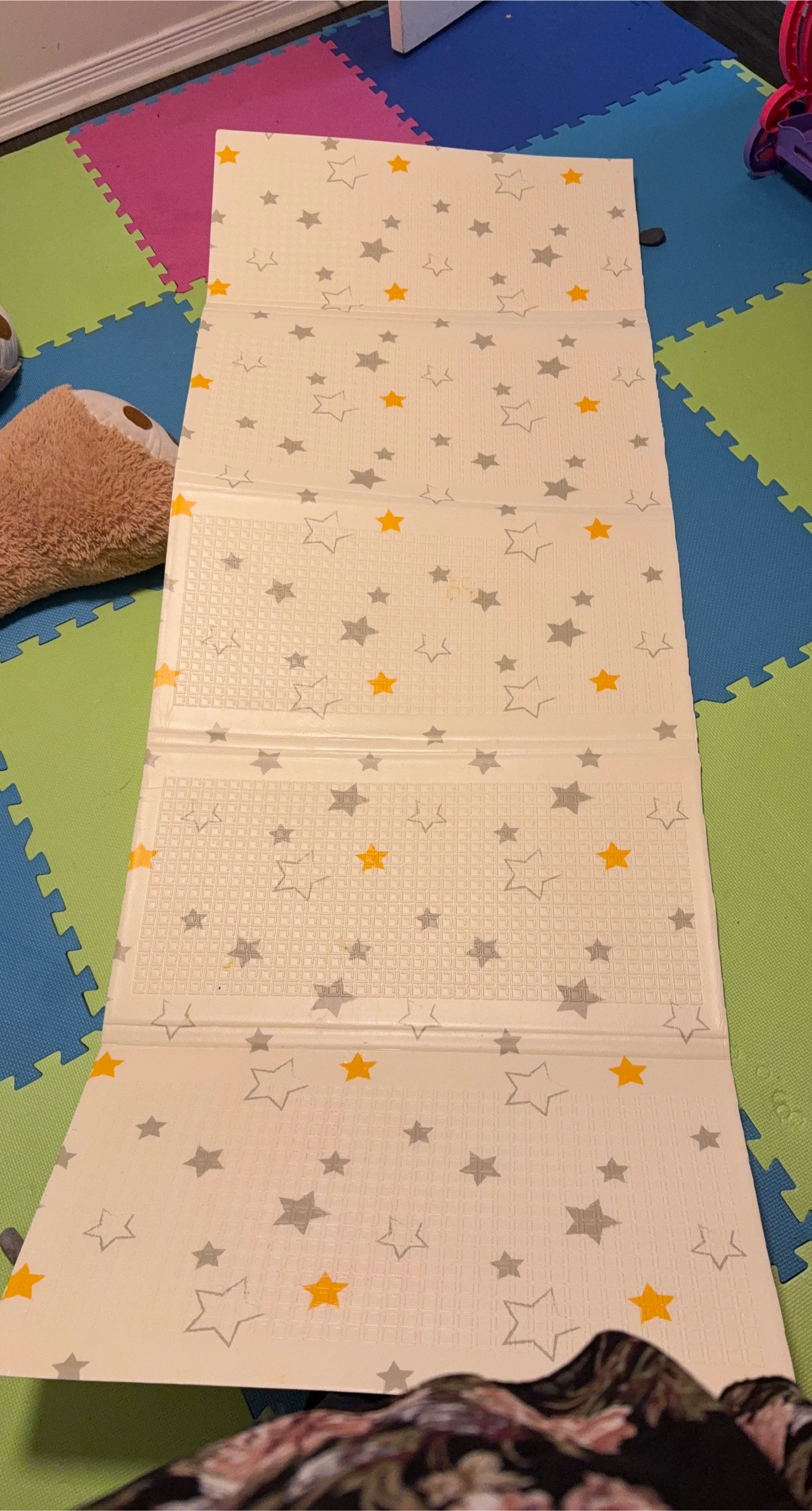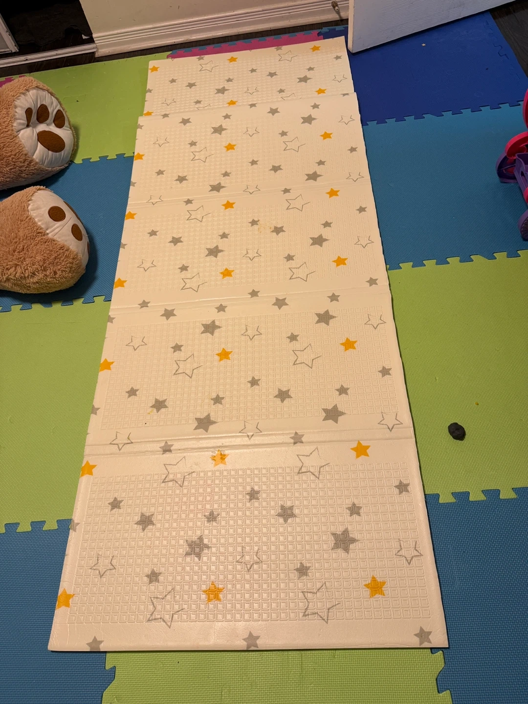 Selling a foldable baby play mat featuring a cute star design! It's perfect for creating a safe and comfortable play area for your little one. The mat is easy to fold and store, making it ideal for small spaces. It's in good condition and ready for a new home!